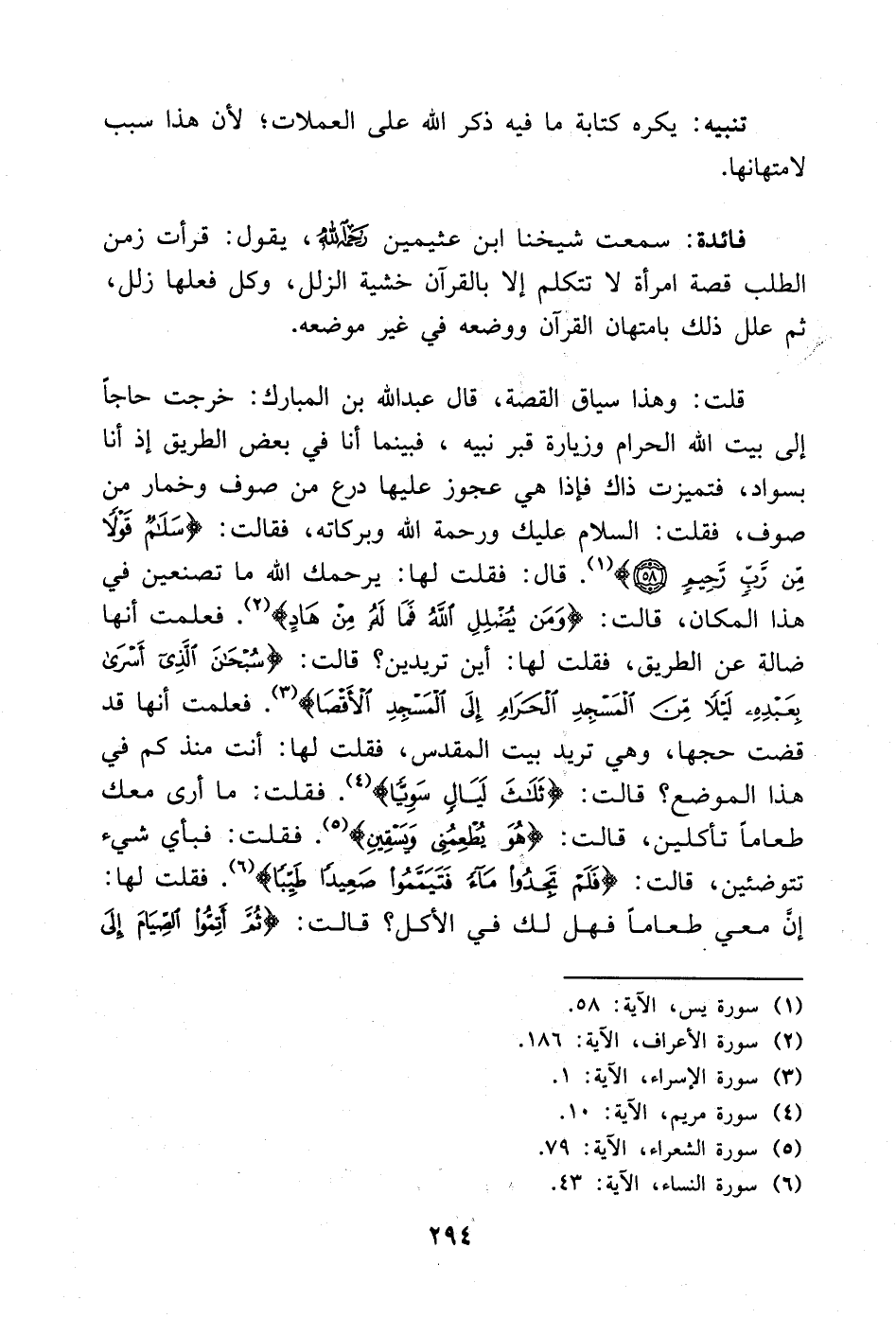 قلت: وهذا سياق القصة، قال: عبد الله بن المبارك،: خرجت حاجًا إلى بيت الله الحرام وزيارة قبر نبيه عليه الصلاة والسلام، فبينما أنا في بعض الطريق إذ أنا بسواد، فتميزت ذاك فإذا هي عجوز عليها درع من صوف وخمار من صوف، فقلت: السلام عليك ورحمة الله وبركاته، فقالت: {سَلَامٌ قَوْلًا مِنْ رَبٍّ رَحِيمٍ} [يس: 58]. قال: فقلت لها: يرحمك الله ما تصنعين في هذا المكان، قالت: {وَمَنْ يُضْلِلِ اللَّهُ فَمَا لَهُ مِنْ هَادٍ} [الرعد: 33]. فعلمت أنها ضالة عن الطريق، فقلت لها: أين تريدين، قالت: {سُبْحَانَ الَّذِي أَسْرَى بِعَبْدِهِ لَيْلًا مِنَ الْمَسْجِدِ الْحَرَامِ إِلَى الْمَسْجِدِ الْأَقْصَى} [الإسراء: 1]. فعلمت أنها قد قضت حجها، وهي تريد بيت المقدس، فقلت لها: أنت منذ كم في هذا الموضع قالت: {ثَلَاثَ لَيَالٍ سَوِيًّا} [مريم: 10]. فقلت: ما أرى معك طعامًا تأكلين، قال: {هُوَ يُطْعِمُنِي وَيَسْقِينِ} [الشعراء: 79]. فقلت: فبأي شيء تتوضئين، قالت: {فَلَمْ تَجِدُوا مَاءً فَتَيَمَّمُوا صَعِيدًا طَيِّبًا} [النساء: 43]. فقلت لها: أن معي طعامًا فهل لك في الأكل، قال: {ثُمَّ أَتِمُّوا الصِّيَامَ إِلَى