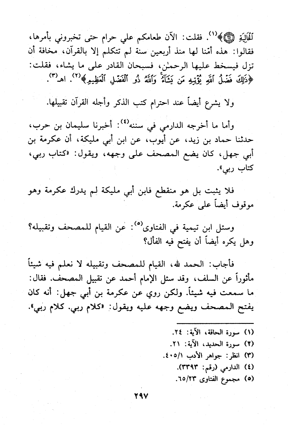 وأما ما أخرجه الدرامي في سننه: (¬2) أخبرنا سليمان بن حرب، حدثنا حماد بن زيد، عن أيوب، عن ابن أبي مليكة، أن عكرمة بن أبي جهل، كان يضع المصحف على وجهه ويقول: «كتاب ربي، كتاب ربي».