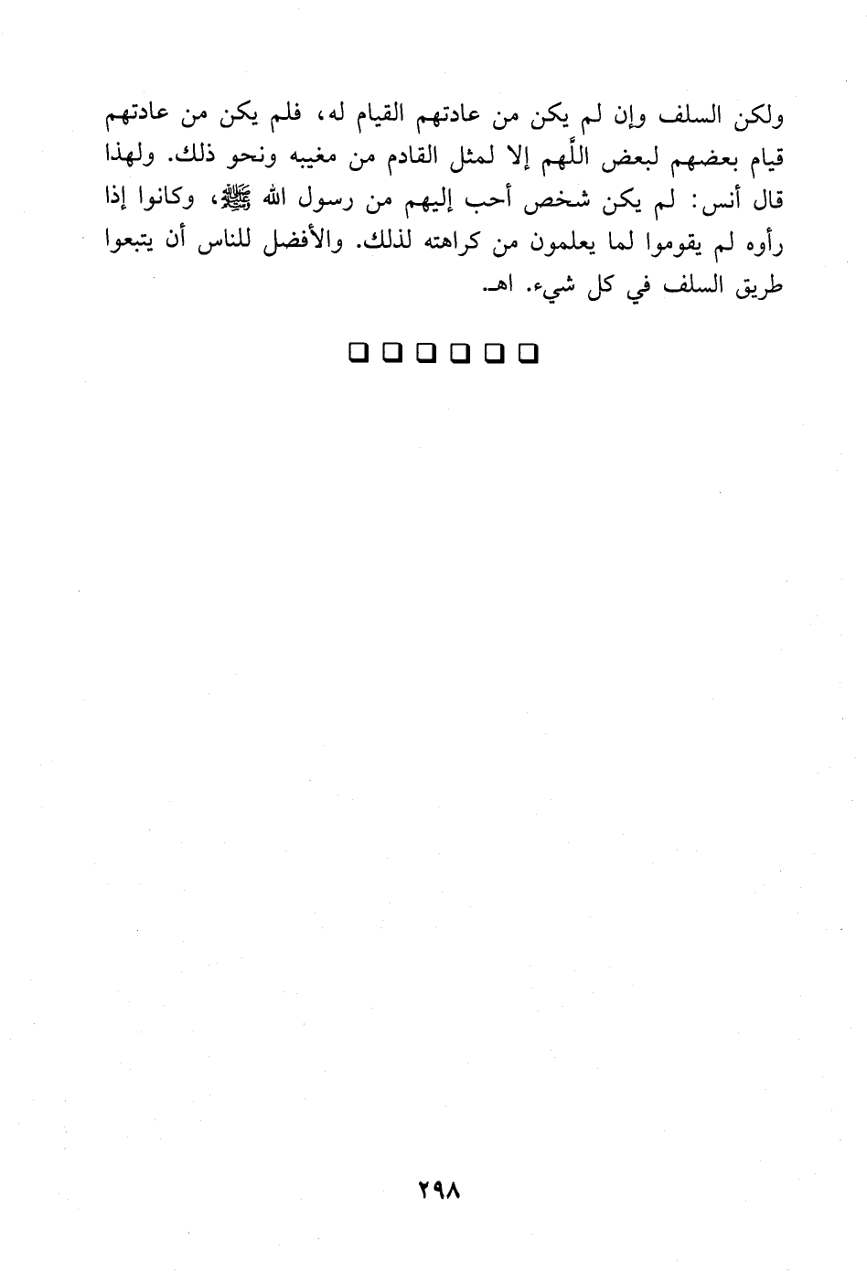 ولكن السلف وإن لم يكن من عادتهم القيام له، فلم يكن من عادتهم قيام بعضهم لبعض اللهم إلا لمثل القادم من مغيبه ونحو ذلك. ولهذا قال أنس: لم يكن شخص أحب إليهم من رسول الله - صلى الله عليه وسلم -، وكانوا إذا رأوه لم يقوموا لما يعلمون من كراهته لذلك. والأفضل للناس أن يتبعوا طريق السلف في كل شيء. ا. هـ.