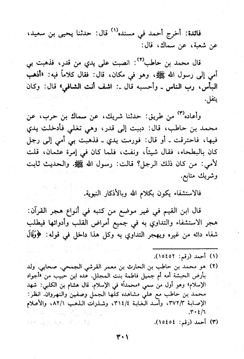 قال محمد بن حاطب: (¬2) انصبت على يدي من قدر، فذهبت بي أمي إلى رسول الله - صلى الله عليه وسلم -، وهو في مكان، قال: فقال كلامًا فيه: «أذهب البأس، رب الناس - وأحسبه قال - اشف أنت الشافي» قال: وكان يتفل.