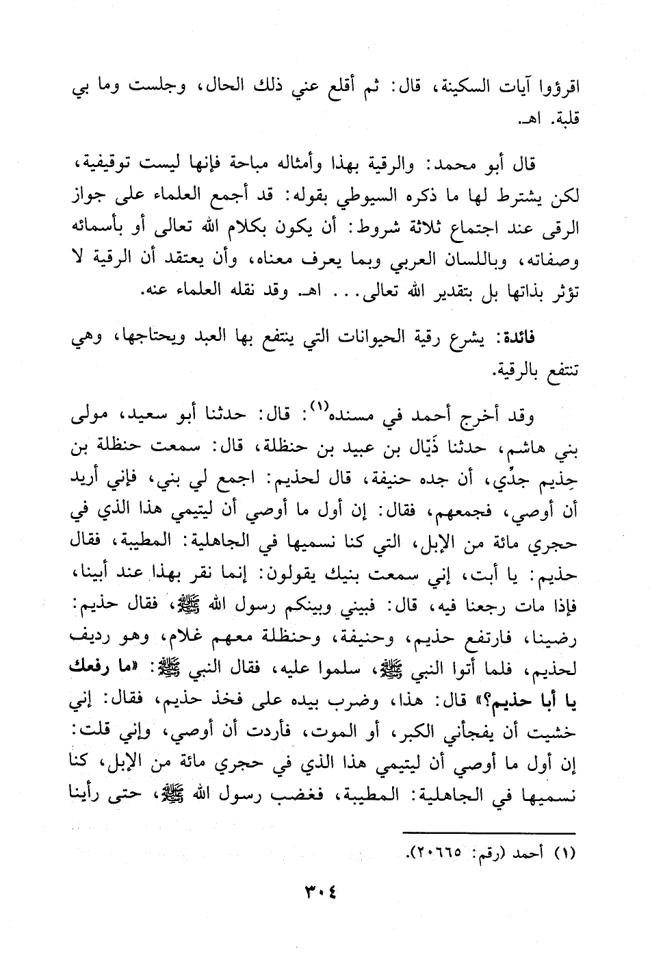 قال أبو محمد: والرقية بهذا وأمثاله مباحة فإنها ليست توقيفية لكن يشترط لها ما ذكره السيوطي بقوله: قد أجمع العلماء على جواز الرقى عند اجتماع ثلاثة شروط: أن يكون بكلام الله تعالى أو بأسمائه وصفاته، وباللسان العربي وبما يعرف معناه، وأن يعتقد أن الرقية لا تؤثر بذاتها بل بتقدير الله تعالى ... ا. هـ. وقد نقله العلماء عنه.