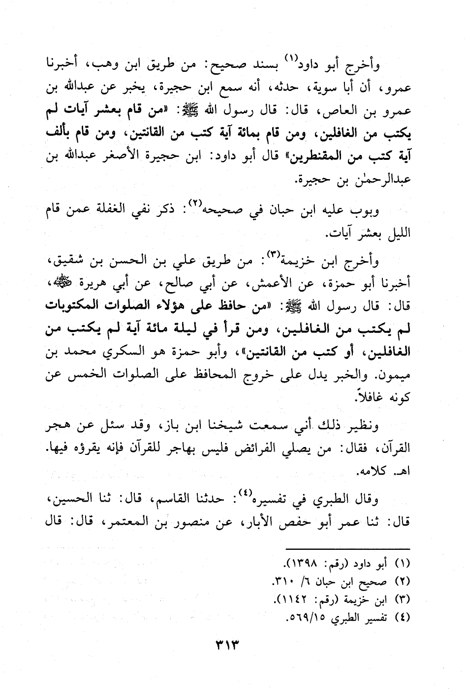 وأخرج أبو داود (¬1) بسند صحيح: من طريق ابن وهب، أخبرنا عمرو، أن أبا سوية، حدثه، أنه سمع ابن حجيرة، يخبر عن عبد الله بن عمرو بن العاص، قال: قال رسول الله - صلى الله عليه وسلم -: «من قام بعشر آيات لم يكتب من الغافلين، ومن قام بمائة آية كتب من القانتين، ومن قام بألف آية كتب من المقنطرين» قال أبو داود: ابن حجيرة الأصغر عبد الله بن عبد الرحمن بن حجيرة».
