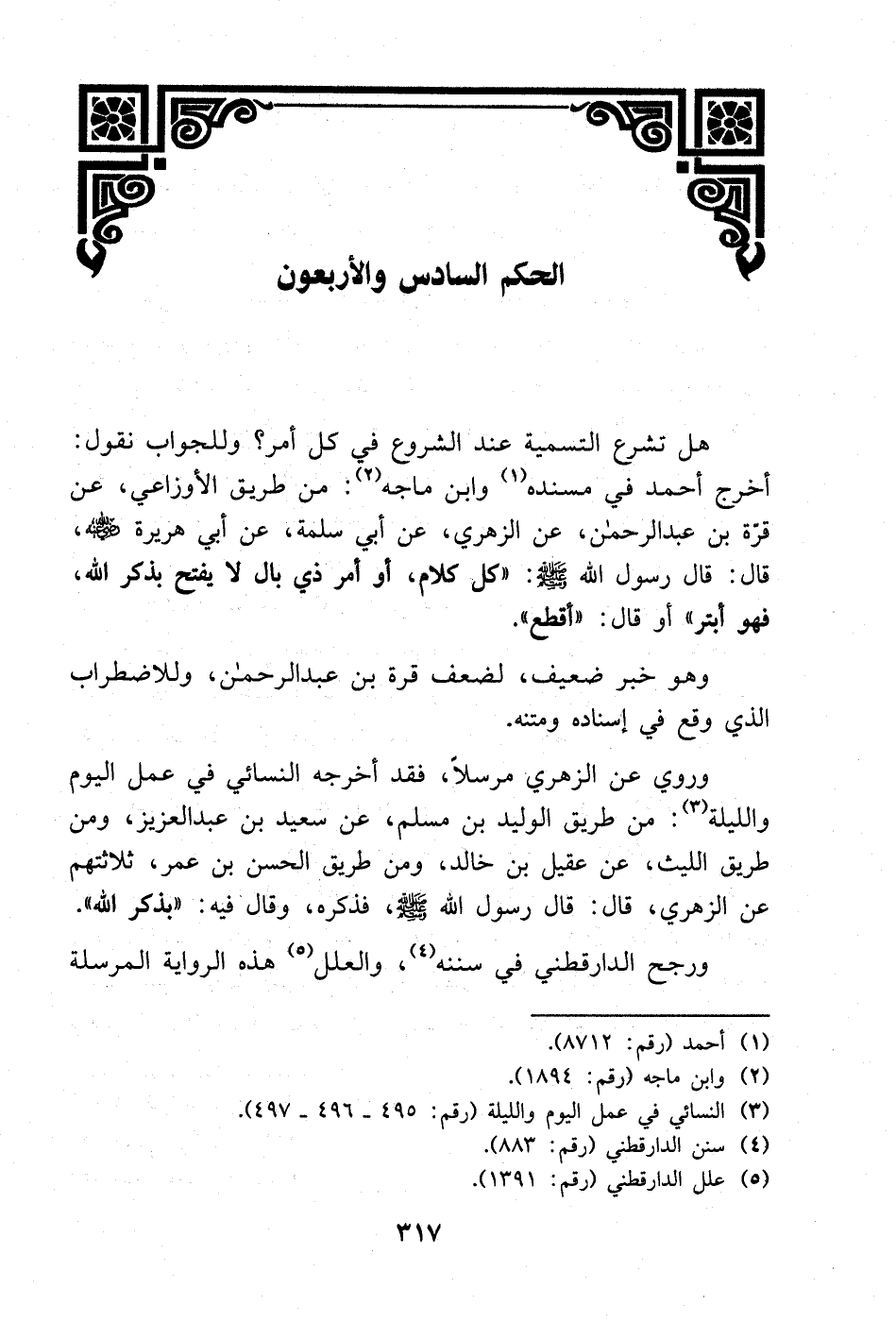 هل تشرع التسمية عند الشروع في كل أمر؟، وللجواب نقول أخرج أحمد في مسنده (¬1) وابن ماجه: (¬2) من طريق الأوزاعي، عن قرة بن عبد الرحمن، عن الزهري، عن أبي سلمه، عن أبي هريرة - رضي الله عنه -، قال: قال رسول الله - صلى الله عليه وسلم -: «كل كلام، أو أمر ذي بال لا يفتح بذكر الله، فهو أبتر» أو قال: «أقطع».