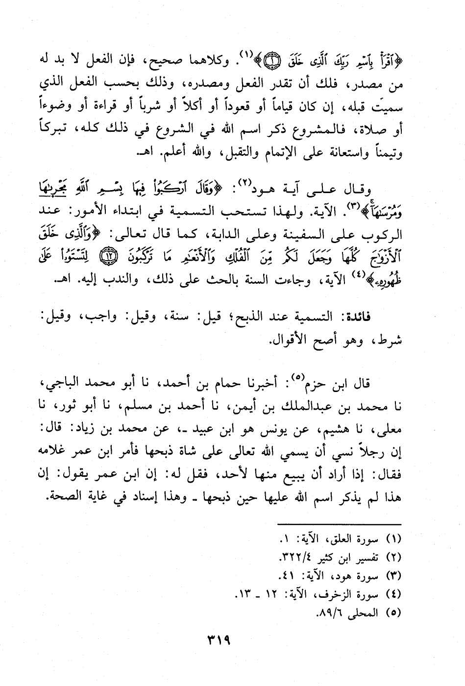 {اقْرَأْ بِاسْمِ رَبِّكَ الَّذِي خَلَقَ} [العلق: 1]. وكلاهما صحيح، فإن الفعل لا بد له من مصدر، فلك أن تقدر الفعل ومصدره، وذلك بحسب الفعل الذي سميت قبله، إن كان قيامًا أو قعودًا أو أكلًا أو شربًا أو قراءة أو وضوءًا أو صلاة، فالمشروع ذكر اسم الله في الشروع في ذلك كله، تبركًا وتيمنًا واستعانة على الإتمام والتقبل، والله أعلم. ا. هـ.