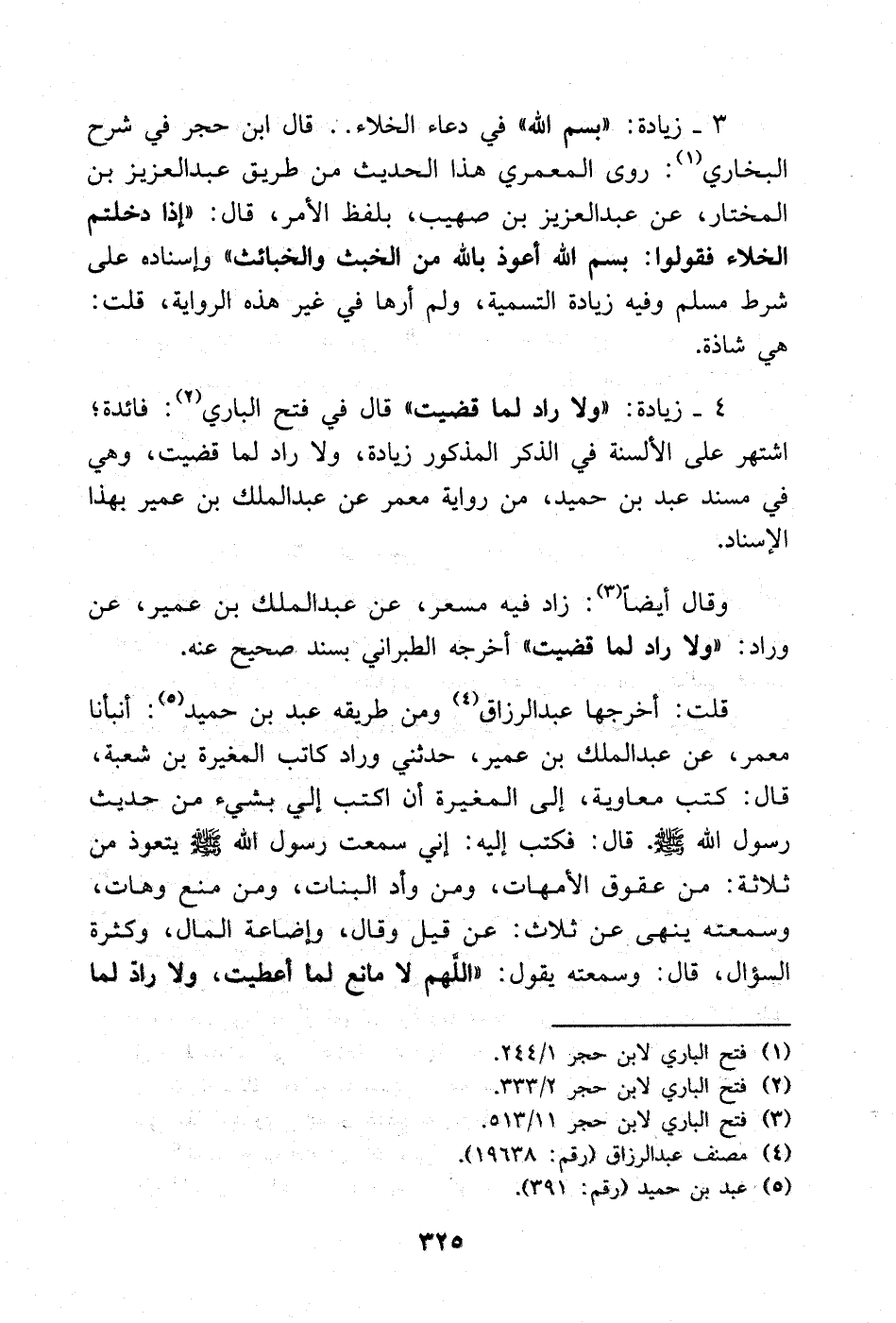 4 - زيادة: «ولا راد لما قضيت» قال في فتح الباري: (¬2) فائدة اشتهر على الألسنة في الذكر المذكور زيادة، ولا راد لما قضيت وهي في مسند عبد بن حميد، من رواية معمر عن عبد الملك بن عمير بهذا الإسناد.