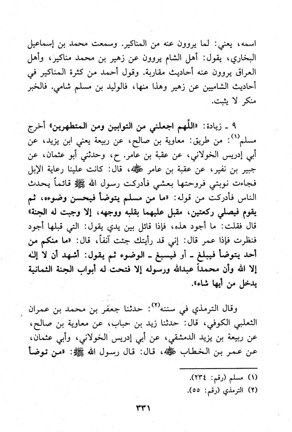 9 - زيادة: «اللهم اجعلني من التوابين ومن المتطهرين» أخرج مسلم: (¬1) من طريق: معاوية بن صالح، عن ربيعة يعني ابن يزيد، عن أبي إدريس الخولاني، عن عقبة بن عامر. ح، وحدثني أبو عثمان، عن جبير بن نفير، عن عقبة بن عامر - صلى الله عليه وسلم -، قال: كانت علينا رعاية الْبل فجاءت نوبتي فروحتها بعشي فأدركت رسول الله - صلى الله عليه وسلم - قائمًا يحدث الناس فأدركت من قوله: «ما من مسلم يتوضأ فيحسن وضوءه، ثم يقوم فيصلي ركعتين، مقبل عليهما بقلبه ووجهه، إلا وجبت له الجنة» قال فقلت: ما أجود هذه فإذا قائل بين يدي يقول: التي قبلها أجود فنظرت فإذا عمر قال: إني قد رأيتك جئت آنفًا، قال: «ما منكم من أحد يتوضأ فيبلغ - أو فيسبغ - الوضوء ثم يقول: أشهد أن لا إله إلا الله وأن محمدا عبد الله ورسوله إلا فتحت له أبواب الجنة الثمانية يدخل من أيها شاء».