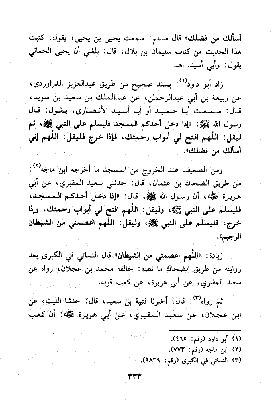 ومن الضعيف عند الخروج من المسجد ما أخرجه ابن ماجه: (¬2) من طريق الضحاك بن عثمان، قال: حدثني سعيد المقبري، عن أبي هريرة - رضي الله عنه -، أن رسول الله - صلى الله عليه وسلم -، قال: «إذا دخل أحدكم المسجد، فليسلم على النبي - صلى الله عليه وسلم -، وليقل: اللهم افتح لي أبواب رحمتك، وإذا خرج، فليسلم على النبي - صلى الله عليه وسلم -، وليقل: اللهم اعصمني من الشيطان الرجيم».