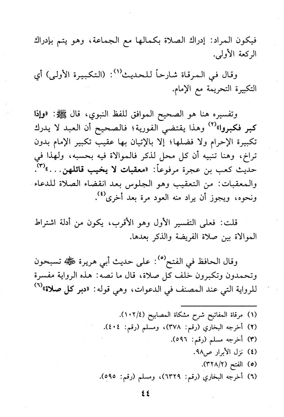 وتفسيره هنا هو الصحيح الموافق للفظ النبوي قال عليه الصلاة والسلام «وإذا كبر فكبروا» (¬2) وهذا يقتضي الفورية فالصحيح أن العبد لا يدر، تكبيرة الإحرام ولا فضلها؛ إلا بالإتيان بها عقيب تكبير الإمام بدون تراخ، وهنا تنبيه أن كل محل لذكر فالموالاة فيه بحسبه، ولهذا في حديث كعب بن عجرة مرفوعًا: «معقبات لا يخيب قائلهن ...». (¬3) والمعقبات: من التعقيب وهو الجلوس بعد انقضاء الصلاة للدعاء ونحوه، ويجوز أن يراد منه العود مرة بعد أخرى. (¬4)