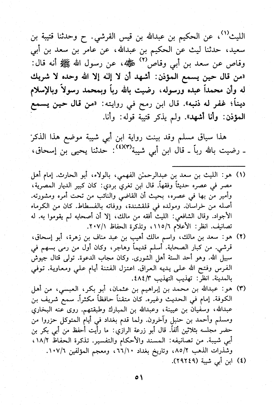 الليث (¬1) عن الحكيم بن عبد الله بن قيس القرشى ح وحدثنا قتيبة بن سعيد حدثنا ليث عن الحكيم بن عبد الله عن عامر بن سعد بن أبى وقاص عن سعد بن أبى وقاص (¬2) - رضي الله عنه - عن رسول الله - صلى الله عليه وسلم - أنه قال: «من قال حين يسمع المؤذن أشهد أن لا إله إلا الله وحده لا شريك له وأن محمدا عبده ورسوله رضيت بالله ربا وبمحمد رسولا وبالْسلام دينا. يفر له ذنبه». قال ابن رمح في روايته «من قال حين يسمع المؤذن وأنا أشهد». ولم يذكر قتيبة قوله وأنا.