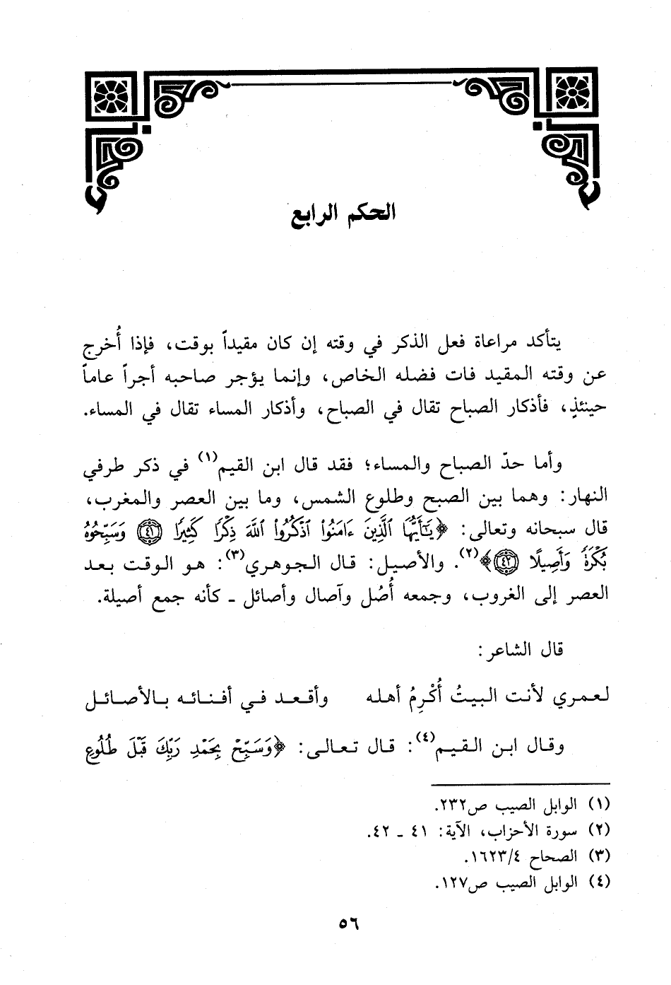 وأما حدّ الصباح والمساء؛ فقد قال ابن القيم: (¬1) في ذكر طرفي النهار، وهما بين الصبح وطلوع الشمس، وما بين العصر والمغرب، قال سبحانه وتعالى: {يَاأَيُّهَا الَّذِينَ آمَنُوا اذْكُرُوا اللَّهَ ذِكْرًا كَثِيرًا (41) وَسَبِّحُوهُ بُكْرَةً وَأَصِيلًا} [الأحزاب: 41، 42] والأصيل: قال الجوهري: (¬2) هو الوقت بعد العصر إلى الغروب وجمعه أُصُل وآصال وأصائل - كأنه جمع أصيلة.