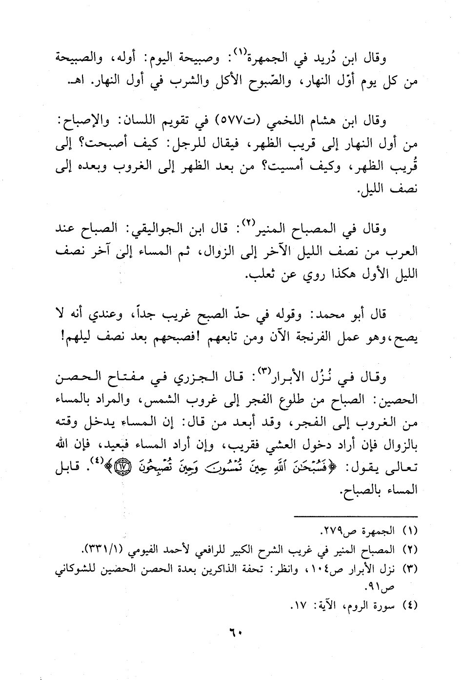 وقال ابن هشام اللخمي (ت557) في تقويم اللسان: والْصباح: من أول النهار إلى قريب الظهر، فيقال للرجل كيف أصبحت إلى قريب الظهر، وكيف أمسيت من بعد الظهر إلى الغروب وبعده إلى نصف الليل.