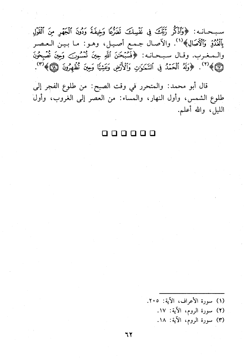 {وَاذْكُرْ رَبَّكَ فِي نَفْسِكَ تَضَرُّعًا وَخِيفَةً وَدُونَ الْجَهْرِ مِنَ الْقَوْلِ بِالْغُدُوِّ وَالْآصَالِ} [الأعراف: 205]. والآصال جمع أصيل، وهو: ما بين العصر والمغرب. وقال سبحانه: {فَسُبْحَانَ اللَّهِ حِينَ تُمْسُونَ وَحِينَ تُصْبِحُونَ} [الروم: 17]. {وَلَهُ الْحَمْدُ فِي السَّمَاوَاتِ وَالْأَرْضِ وَعَشِيًّا وَحِينَ تُظْهِرُونَ} [الروم: 18].