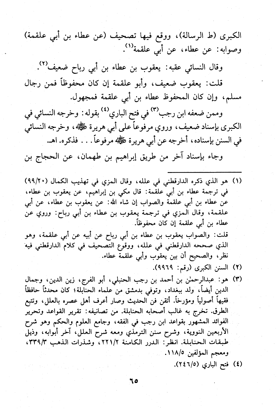 قلت: والصواب يعقوب بن عطاء بن أبي رباح عن أبيه عن أبي علقمة، وهو الذي صححه الدارقطني في علله، ووقوع التصحيف في كلام الدارقطني فيه نظر، والصحيح أن بين يعقوب وأبي علقمة عطاء.