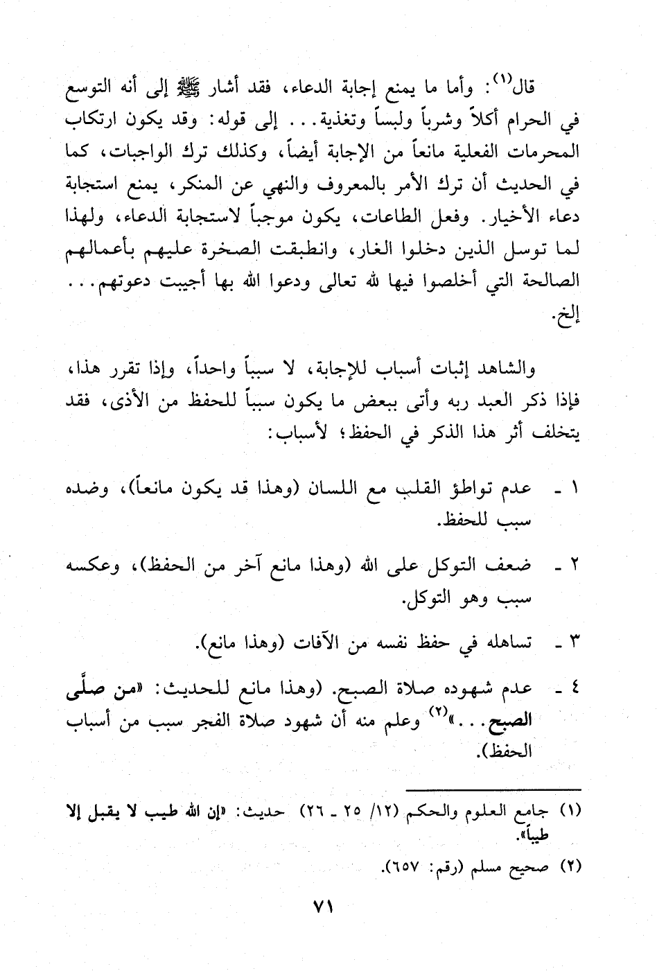 4 - عدم شهوده صلاة الصبح. (وهذا مانع للحديث: «من صلى الصبح ...» (¬2) وعلم منه أن شهود صلاة الفار سبب من أسباب الحفظ).