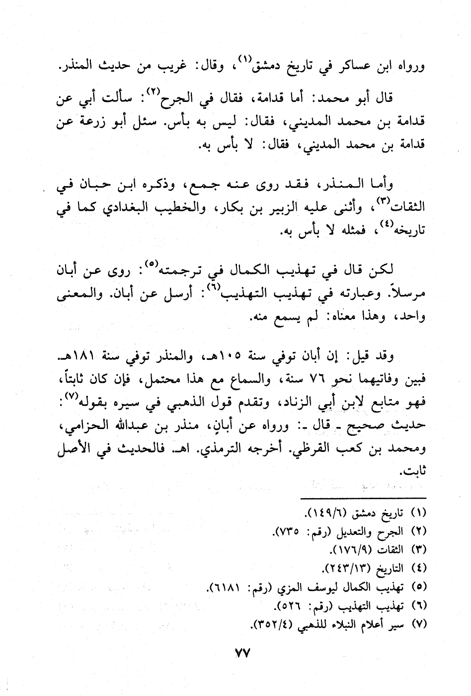 وقد قيل إن أبان توفي سنة 105هـ، والمنذر توفي سنة 181هـ. فبين وفاتيهما نحو 76 سنة، والسماع مع هذا محتمل، فإن كان ثابتًا، فهو متابع لابن أبي الزناد، وتقدم قول الذهبي في سيره بقوله: (¬7) حديث صحيح - قال - ورواه عن أبان منذر بن عبد الله الحزامي، ومحمد بن كعب القرظي.