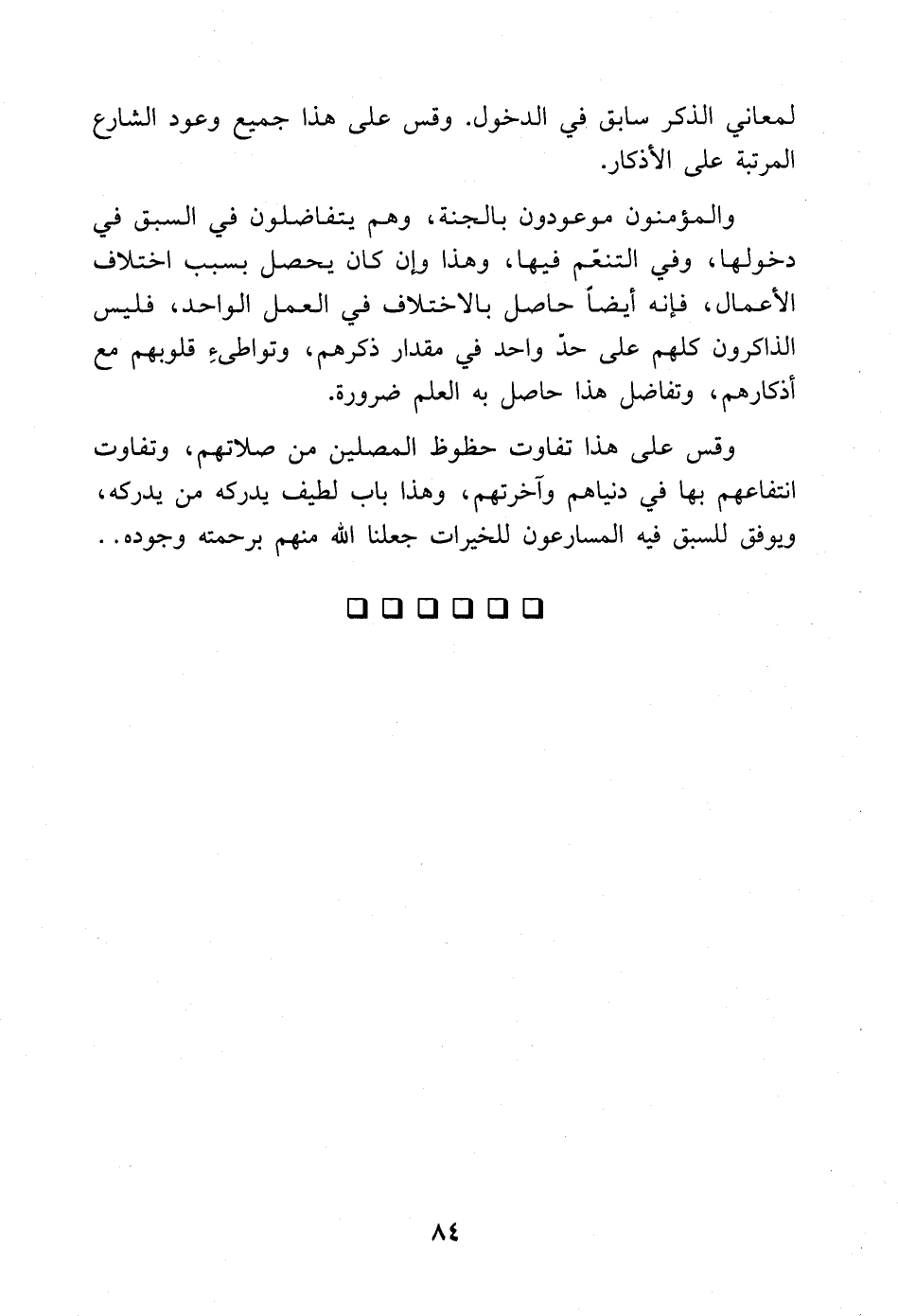والمؤمنون موعودون بالجنة، وهم يتفاضلون في السبق في دخولها، وفي التنّعم فيها، وهذا وإن كان يحصل بسبب اختلاف الأعمال، فإنه أيضًا حاصل بالاختلاف في العمل الواحد، فليس الذاكرون كلهم على حدّ واحد في مقدار ذكرهم، وتواطؤ قلوبهم مع أذكارهم، وتفاضل هذا حاصل به العلم ضرورة.