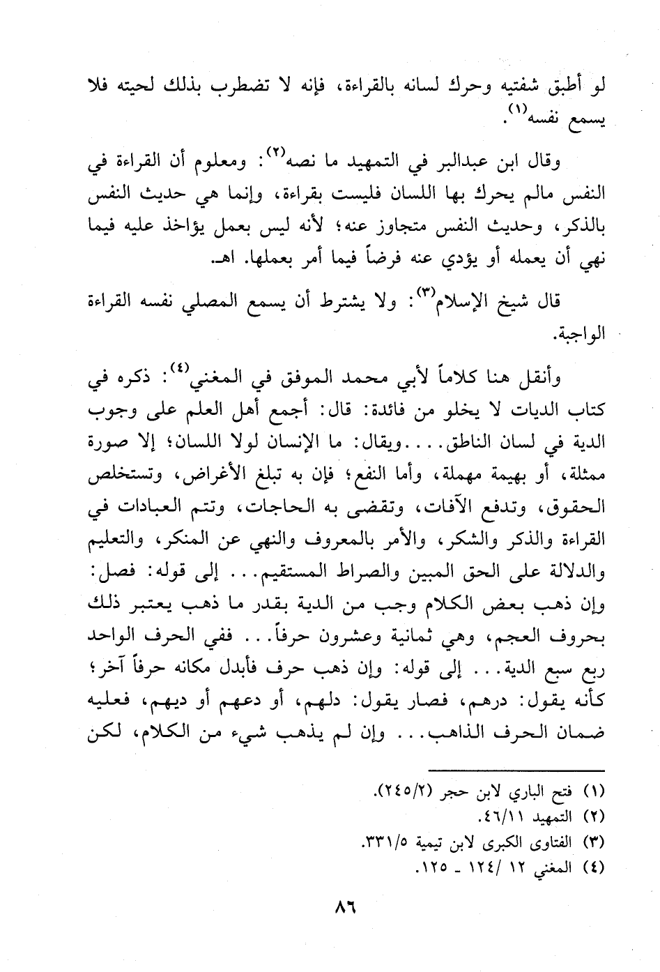 وقال ابن عبد البر في التمهيد ما نصه: (¬2) ومعلوم أن القراءة في النفس ما لم يحرك بها اللسان فليست بقراءة وإنما هي حديث النفس بالذكر وحديث النفس متجاوز عنه لأنه ليس بعمل يؤاخذ عليه فيما نهي أن يعمله أو يؤدي عنه فرضًا فيما أمر بعملها. ا. هـ.