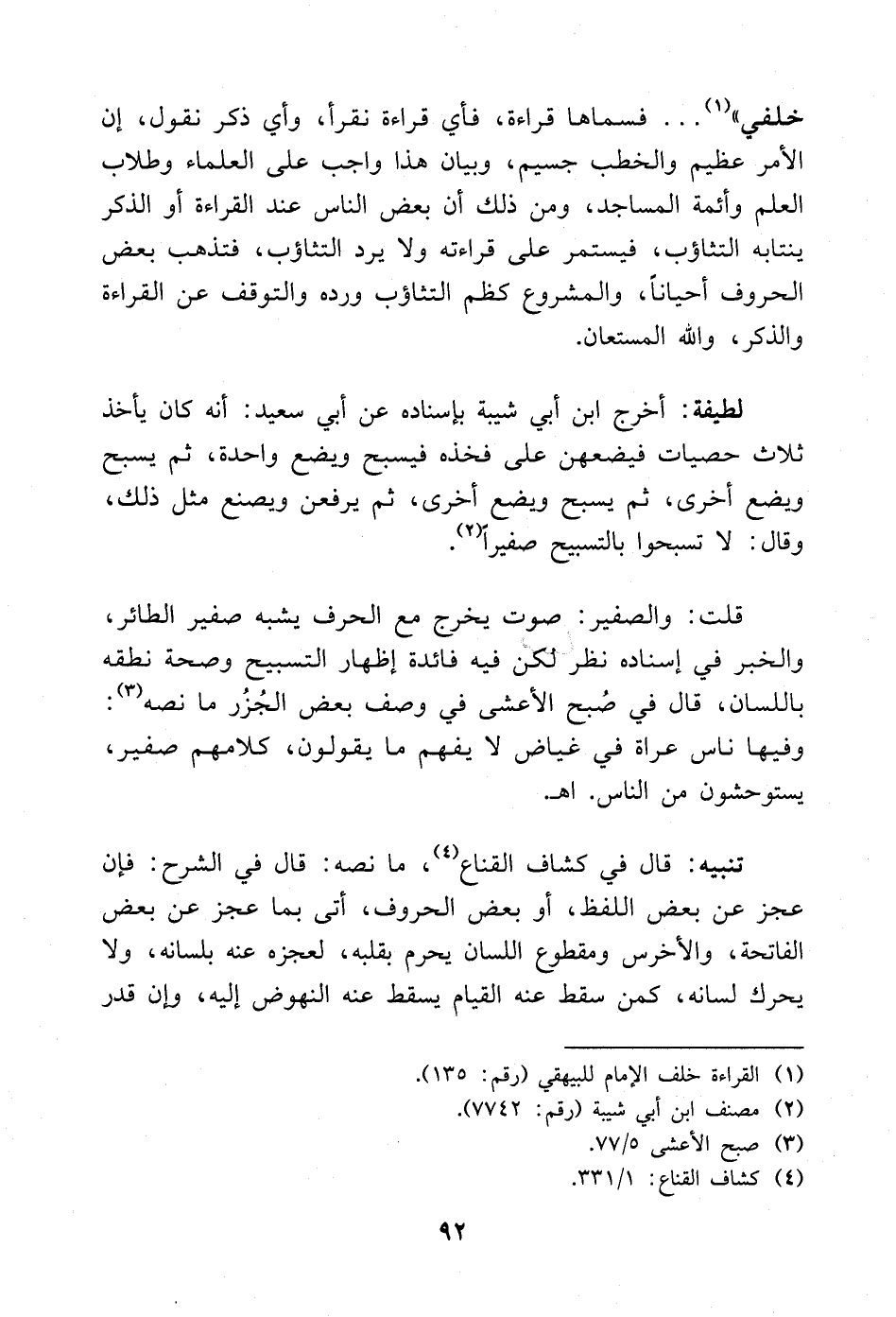 خلفي» (¬1) ... فسماها قراءة، فأي قراءة نقرأ، وأي ذكر نقول، إن الأمر عظيم والخطب الجسيم، وبيان هذا واجب على العلماء وطلاب العلم وأئمة المساجد، ومن ذلك أن بعض الناس عند القراءة أو الذكر ينتابه التثاؤب، فيستمر على قراءته ولا يرد التثاؤب، فتذهب بعض الحروف أحيانا، والمشروع كظم التثاؤب ورده والتوقف عن القراءة والذكر والله المستعان.