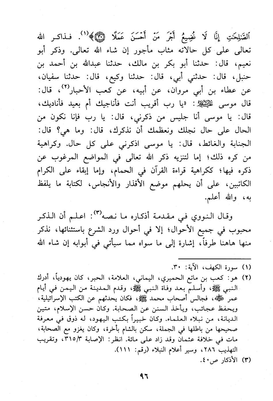 وقال النووي في مقدمة أذكاره ما نصه: (¬2) اعلم أن الذكر محبوب في جميع الأحوال؛ إلا في أحوال ورد الشرع باستثنائها، نذكر منها هنا طرفا، إشارة إلى ما سواه مما سيأتي في أبوابه إن شاء الله