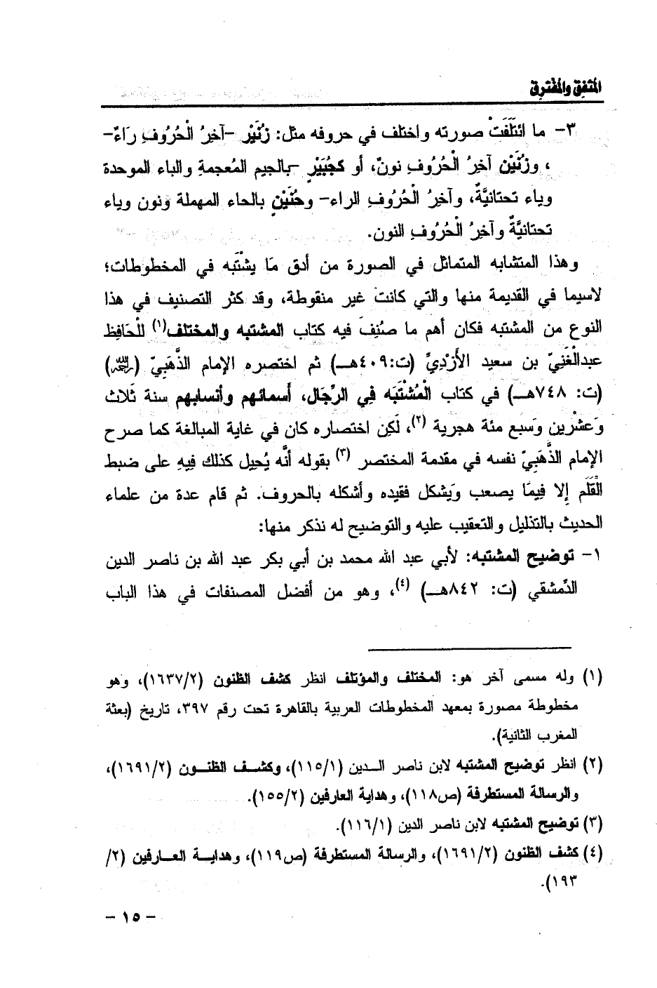 وهذا المتشابه المتماثل في الصورة من أدق مَا يشْتَبه في المخطوطات؛ لاسيما في القديمة منها والتي كانت غير منقوطة، وقد كثر التصنيف في هذا النوع من المشتبه فكان أهم ما صُنِفَ فيه كتاب المشتبه والمختلف (¬1) للْحَافِظ عبدالْغَنِيّ بن سعيد الأَزْدِيِّ (ت: 409 هـ) ثم اختصره الإمام الذَّهَبِيّ رَحمَه الله (ت: 748 هـ) في كتاب الْمُشْتَبَه فِي الرِّجَال، أَسمائهم وأنسابهم سنة ثَلاث وَعشْرين وَسبع مئة هجرية (¬2)، لَكِن اختصاره كان في غاية المبالغة كما صرح الإمام الذَّهَبِيّ نفسه في مقدمة المختصر (¬3) بقوله أنَّه يُحِيل كذلك فِيهِ على ضبط الْقَلَم إِلا فِيمَا يصعب وَيشكل فقيده وأشكله بالحروف. ثم قام عدة من علماء الحديث بالتذليل والتعقيب عليه والتوضيح له نذكر منها: