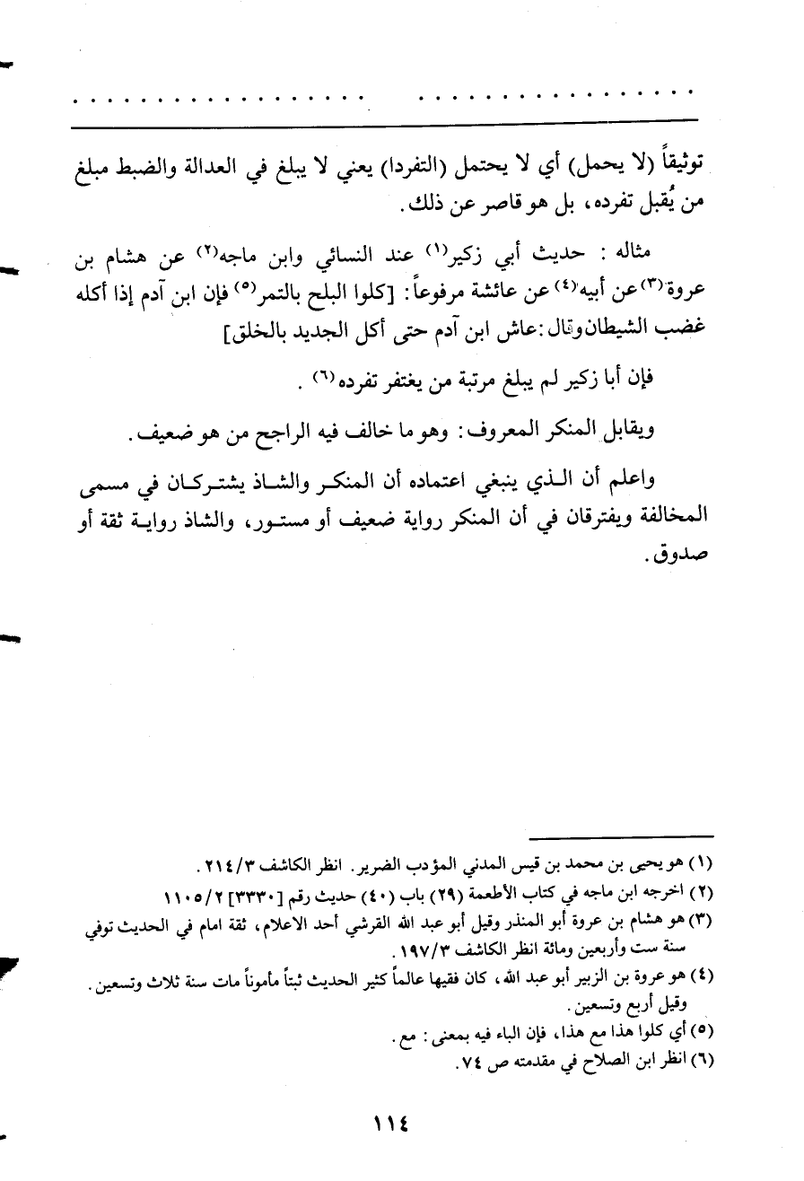 مِثَاله حَدِيث أبي زُكَيْرٍ عِنْد النَّسَائِيّ وَابْن مَاجَه عَن هِشَام بن عُرْوَة عَن أَبِيه عَن عائشه مَرْفُوعا كلوا البلح بِالتَّمْرِ فَإِن ابْن آدم إِذا أكله غضب الشَّيْطَان وَقَالَ عَاشَ ابْن آدم حَتَّى أكل الْجَدِيد بالخلق