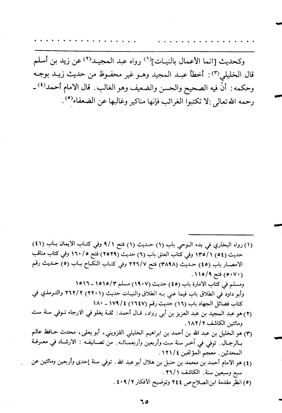 وكحديث انما الْأَعْمَال بِالنِّيَّاتِ رَوَاهُ عبد الْمجِيد عَن زيد بن أسلم قَالَ الخليلي أَخطَأ عبد الْمجِيد وَهُوَ غير مَحْفُوظ من حَدِيث زيد بِوَجْه وَحكمه أَن فِيهِ الصَّحِيح وَالْحسن والضعيف وَهُوَ الْغَالِب قَالَ الامام أَحْمد رَحمَه الله تَعَالَى لَا تكْتبُوا الغرائب فَإِنَّهَا مَنَاكِير وغالبها عَن الضُّعَفَاء