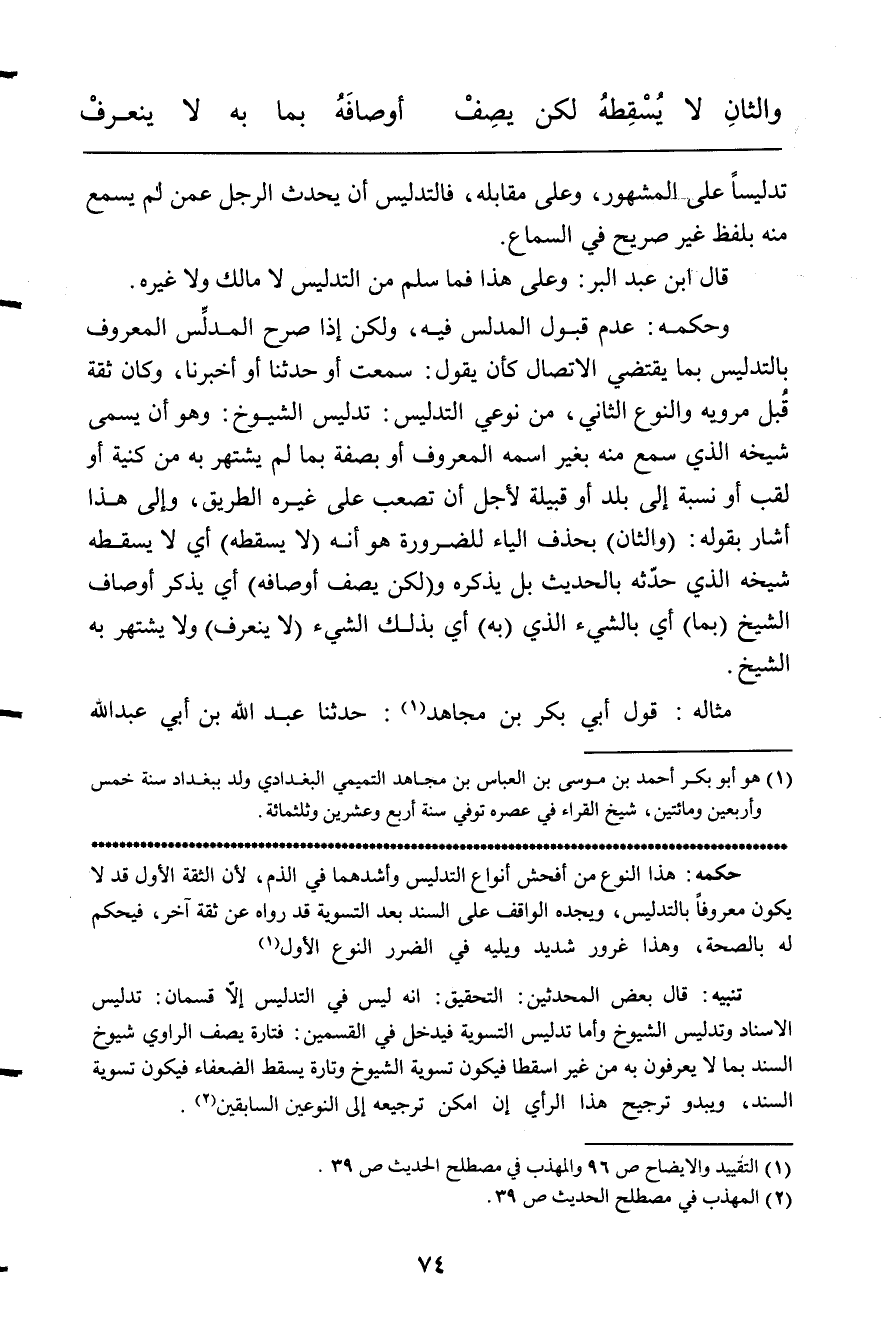 وَحكمه عدم قبُول المدلس فِيهِ وَلَكِن إِذا صرح المدلس الْمَعْرُوف بالتدليس بِمَا يَقْتَضِي الِاتِّصَال كَأَن يَقُول سَمِعت أَو حَدثنَا أَو أخبرنَا وَكَانَ ثِقَة قبل مرويه وَالنَّوْع الثَّانِي من نَوْعي التَّدْلِيس تَدْلِيس الشُّيُوخ وَهُوَ أَن يُسمى شَيْخه الَّذِي سمع مِنْهُ بِغَيْر اسْمه الْمَعْرُوف أَو بِصفة بِمَا لم يشْتَهر بِهِ من كنية أَو لقب أَو نِسْبَة إِلَى بلد أَو قَبيلَة لأجل أَن تصعب على غَيره الطَّرِيق وَإِلَى هَذَا أَشَارَ بقوله والثان بِحَذْف الْيَاء للضَّرُورَة هُوَ أَنه لَا يسْقطهُ أَي لَا يسْقطهُ شَيْخه الَّذِي حَدثهُ بِالْحَدِيثِ بل يذكرهُ وَلَكِن يصف أَوْصَافه أَي يذكر أَوْصَاف الشَّيْخ بِمَا أَي بالشَّيْء الَّذِي بِهِ أَي بذلك الشَّيْء لَا ينعرف وَلَا يشْتَهر بِهِ الشَّيْخ