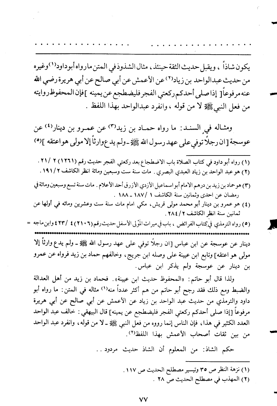 يكون شاذا وَيقبل حَدِيث الثِّقَة حِينَئِذٍ مِثَال الشذوذ فِي الْمَتْن مَا رَوَاهُ أَبُو دَاوُد وَغَيره من حَدِيث عبد الْوَاحِد بن زِيَاد عَن الْأَعْمَش عَن أبي صَالح عَن أبي هُرَيْرَة رَضِي الله عَنهُ مَرْفُوعا إِذا صلى أحدكُم رَكْعَتي الْفجْر فليضطجع عَن يَمِينه فَإِن الْمَحْفُوظ رِوَايَته من فعل النَّبِي صلى الله عَلَيْهِ وَسلم لَا من قَوْله وَانْفَرَدَ عبد الْوَاحِد بِهَذَا اللَّفْظ