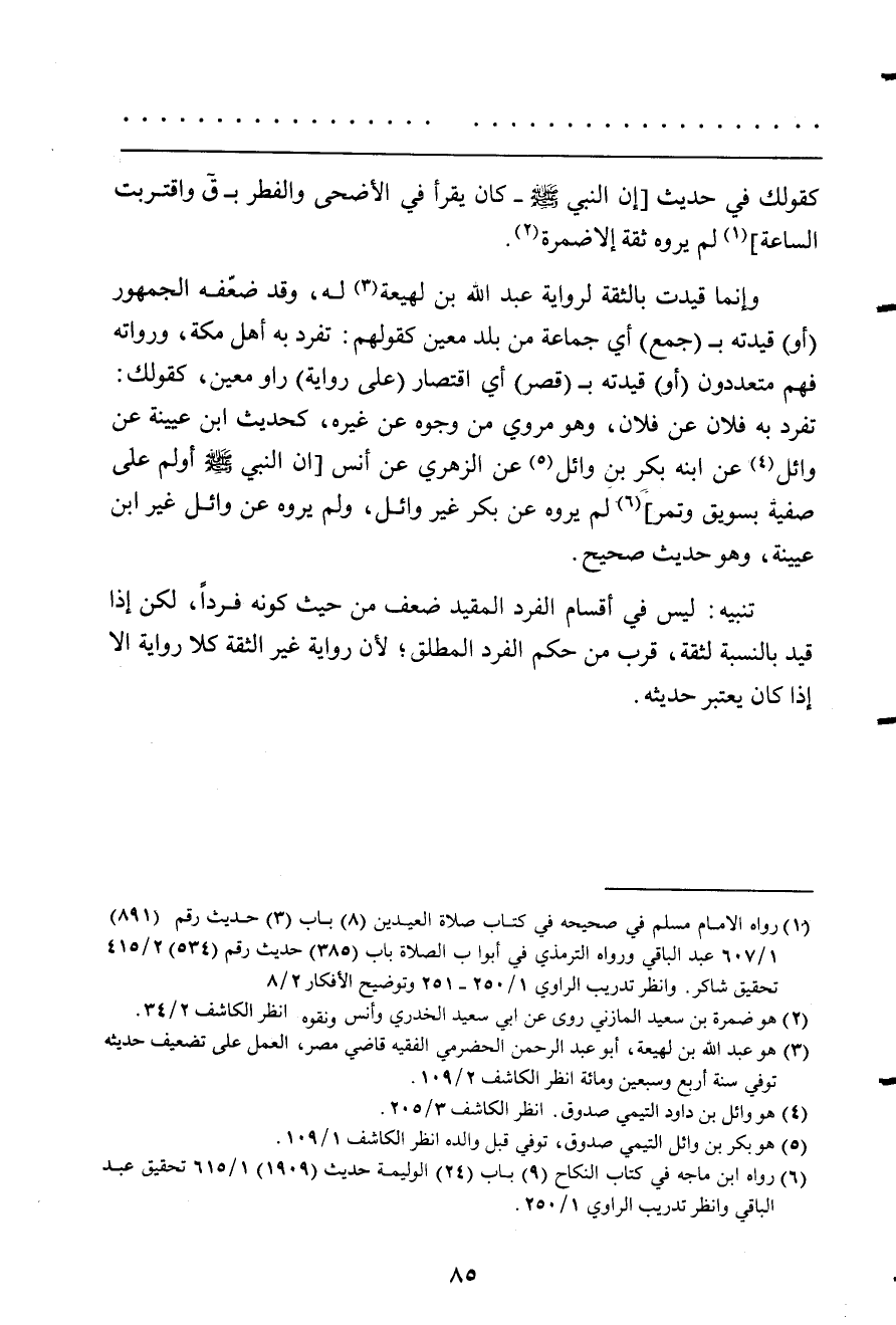 وإتما قيدت بالثقة لرِوَايَة عبد الله بن لَهِيعَة لَهُ وَقد ضعفه الْجُمْهُور أَو قيدته بِجمع أَي جمَاعَة من بلد معِين كَقَوْلِهِم تفرد بِهِ أهل مَكَّة وَرُوَاته فيهم متعددون أَو قيدته بقصر أَي اقْتِصَار على رِوَايَة راو معِين كَقَوْلِك تفرد بِهِ فلَان عَن فلَان وَهُوَ مَرْوِيّ من وُجُوه عَن غَيره كَحَدِيث ابْن عيينه عَن وَائِل عَن ابْنه بكر بن وَائِل عَن الزُّهْرِيّ عَن أنس ان النَّبِي صلى الله عَلَيْهِ وَسلم أولم على صَفِيَّة بسويق وتمر لم يروه عَن بكر غير وَائِل وَلم يروه عَن وَائِل غير ابْن عيينه وَهُوَ حَدِيث صَحِيح