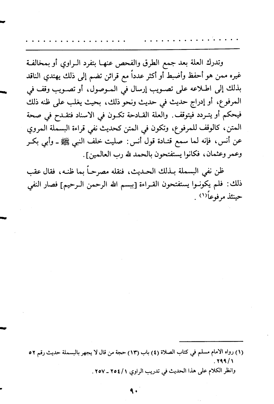 وتدرك الْعلَّة بعد جمع الطّرق والفحص عَنْهَا بتفرد الرَّاوِي أَو بمخالفة غَيره مِمَّن هُوَ أحفظ وأضبط أَو أَكثر عددا مَعَ قَرَائِن تضم إِلَى ذَلِك يَهْتَدِي النَّاقِد بذلك إِلَى اطِّلَاعه على تصويب إرْسَال فِي الْمَوْصُول أَو تصويب وقف فِي الْمَرْفُوع أَو إدراج حَدِيث فِي حَدِيث وَنَحْو ذَلِك بِحَيْثُ يغلب على ظَنّه ذَلِك فَيحكم أَو يتَرَدَّد فَيتَوَقَّف وَالْعلَّة القادحة تكون فِي الاسناد فتقدح فِي صِحَة الْمَتْن كالوقف لِلْمَرْفُوعِ وَتَكون فِي الْمَتْن كَحَدِيث نفي قِرَاءَة الْبَسْمَلَة الْمَرْوِيّ عَن أنس فَإِنَّهُ لما سمع قَتَادَة قَول أنس صليت خلف النَّبِي صلى الله عَلَيْهِ وَسلم وَأبي بكر وَعمر وَعُثْمَان فَكَانُوا يستفتحون بِالْحَمْد لله رب الْعَالمين