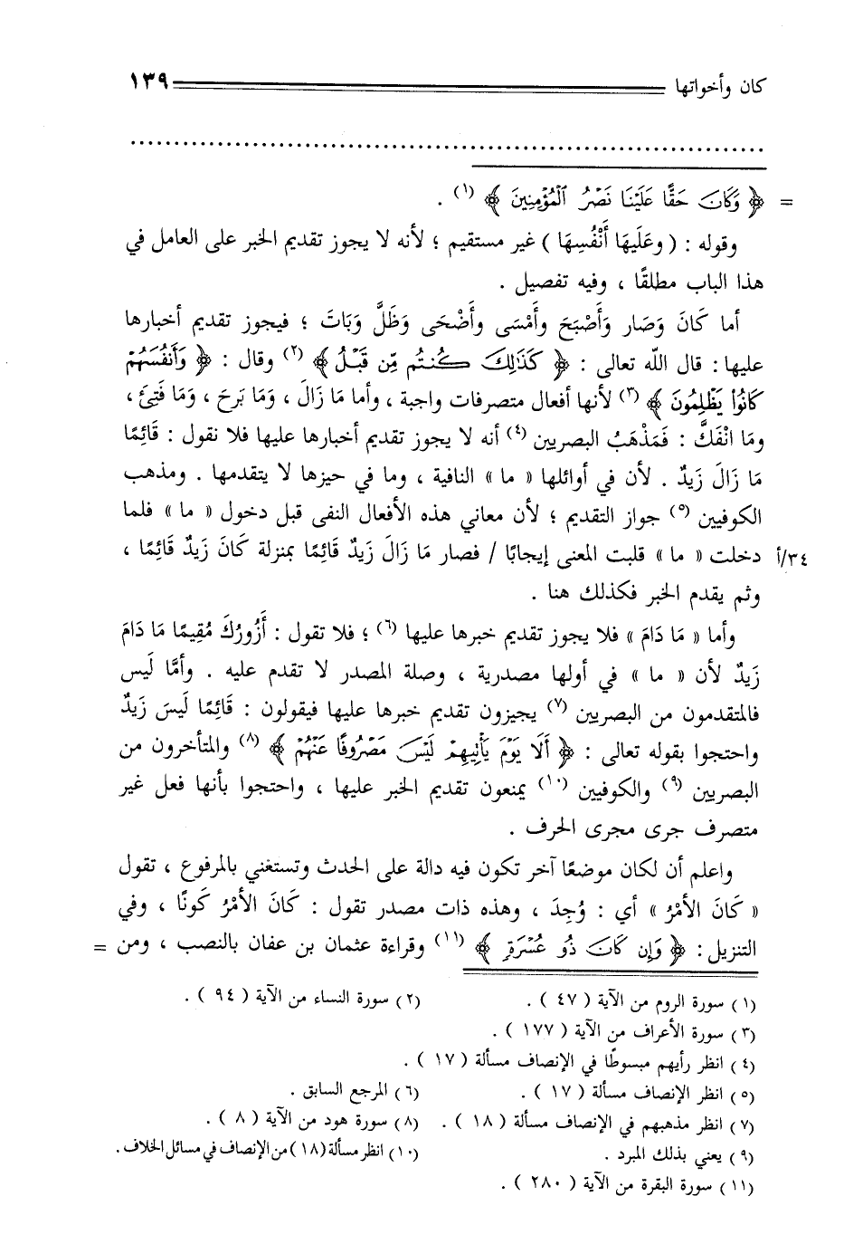 أما كان وصار وأصبح وأمسى وأضحى وظل وبات, فيجوز تقديم أخبارها عليها: قال الله تعالى: {كذلك كنتم من قبل} وقال: {وأنفسهم كانوا يظلمون} لأنها أفعال متصرفات واجبة, وأما ما زال, وما برح, وما فتئ, وما انفك: فمذهب البصريين أنه لا يجوز تقديم أخبارها عليها فلا تقول: قائمًا ما زال زيد. لأن في أوائلها «ما» النافية, وما في حيزها لا يتقدمها. ومذهب الكوفيين جواز التقديم, لأن معاني هذه الأفعال النفي قبل دخول «ما» فلما 34/أدخلت «ما» قلبت المعنى إيجابًا / فصار ما زال زيد قائمًا بمنزلة كان زيد قائمًا, وثم يقدم الخبر فكذلك هنا.