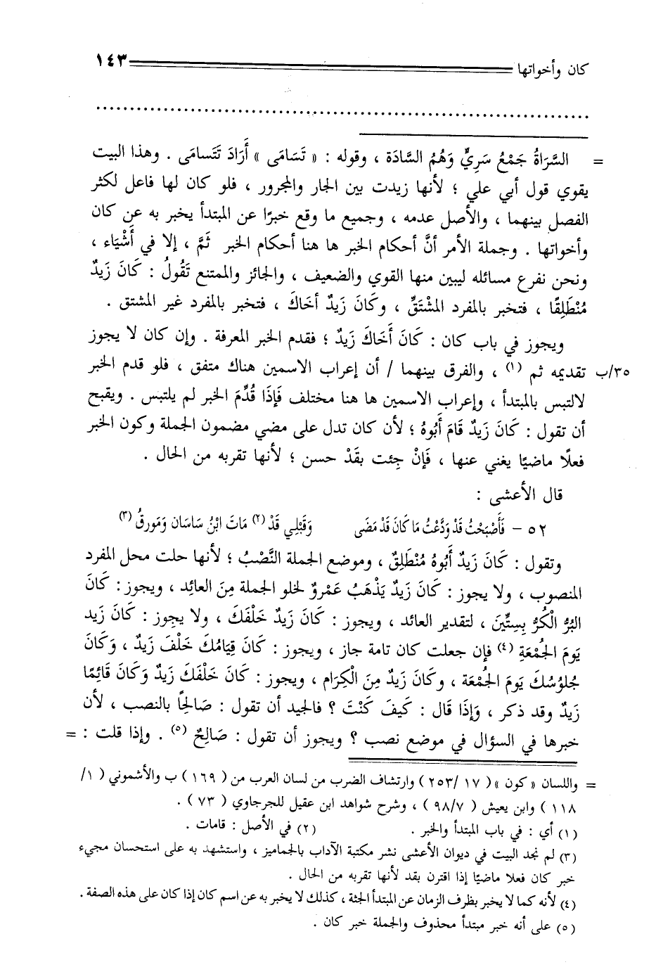 = السراة جمع سري وهم السادة, وقوله: «تسامى» أراد تنسامى. وهذا البيت يقوي قول أبي علي, لأنها زيدت بين الجار والمجرور, فلو كان لها فاعل لكثر الفصل بينهما, والأصل عدمه, وجميع ما وقع خبرًا عن المبتدأ يخبر به عن كان وأخواتها. وجملة الأمر أن أحكام الخبر ها هنا أحكام الخبر ثم, إلا في أشياء, ونحن نفرع مسائله ليبين منها القوي والضعيف, والجائز والممتنع تقول: كان زيد منطلقًا, فتخبر بالمفرد المشتق, وكان زيد أخاك, فتخبر بالمفرد غير المشتق.