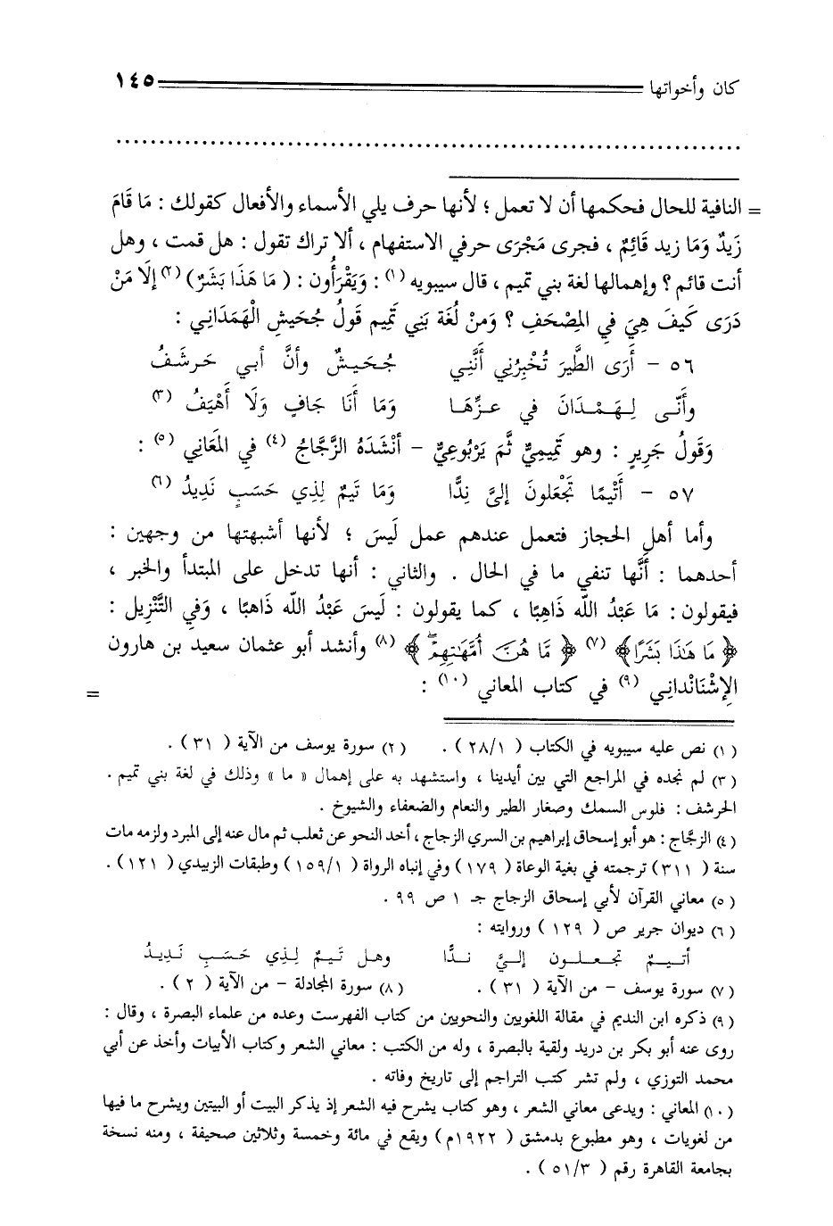 = النافية للحال فحكمها أن لا تعمل, لأنها حرف يلي الأسماء والأفعال كقولك: ما قام زيد وما زيد قائم, فجرى مجرى حرفي الاستفهام, ألا تراك تقول: هل قمت, وهل أنت قائم؟ وإهمالها لغة بني تميم, قال سيبويه: ويقرأون: (ما هذا بشر) إلا من درى كيف هي في المصحف؟ ومن لغة بني تميم قول جحيش الهمداني: