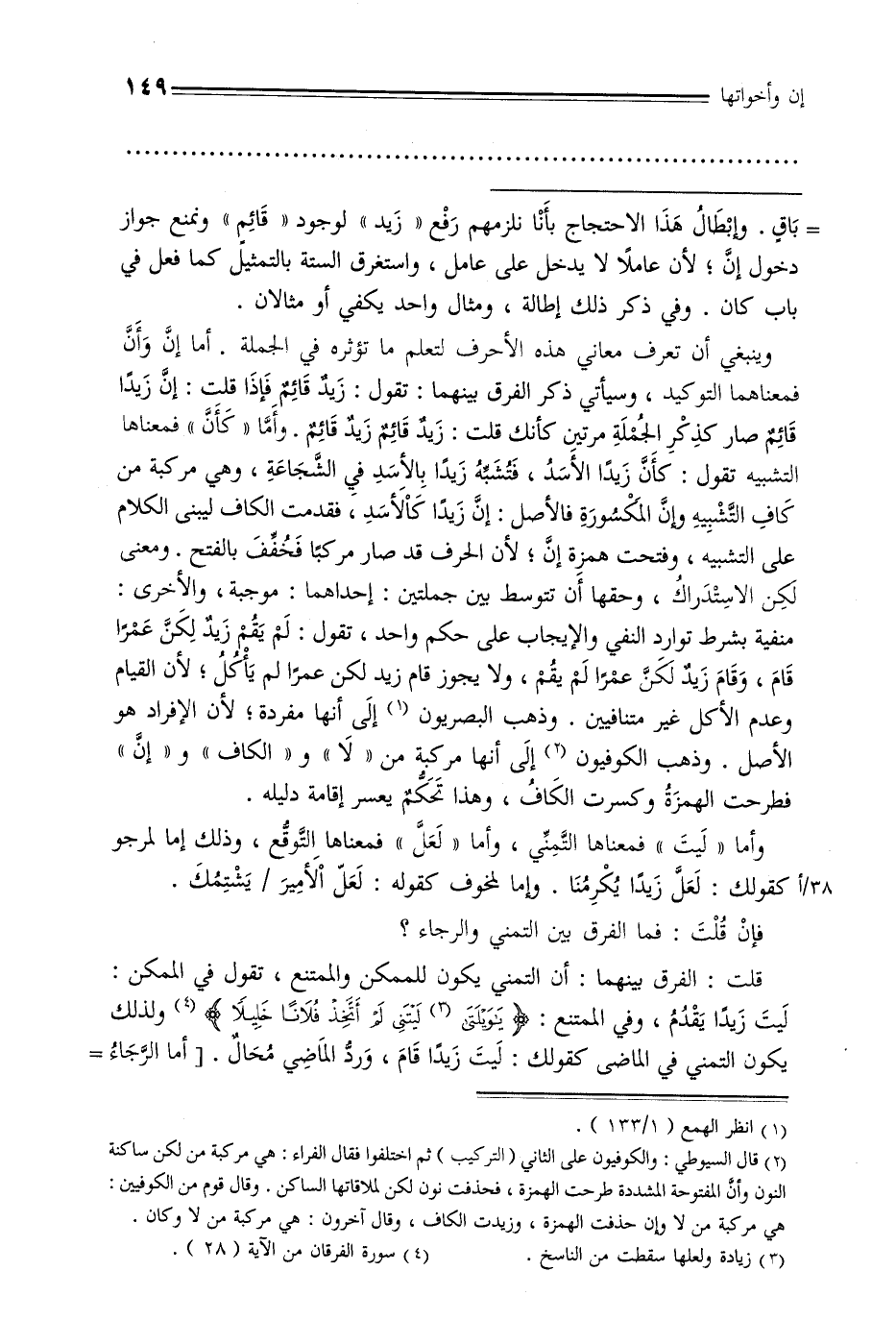 وينبغي أن تعرف معاني هذه الأحرف لتعلم ما تؤثره في الجملة. أما إن وأن فمعناهما التوكيد, وسيأتي ذكر الفرق بينهما: تقول: زيد قائم فإذا قلت: إن زيدًا قائم صار كذكر الجملة مرتين كأنك قلت: زيد قائم زيد قائم. وأما «كأن» فمعناها التشبيه تقول: كأن زيدًا الأسد, فتشبه زيدًا بالأسد في الشجاعة, وهي مركبة من كاف التشبيه وإن المكسورة فالأصل: إن زيدًا كالأسد, فقدمت الكاف ليبنى الكلام على التشبيه, وفتحت همزة إن, لأن الحرف قد صار مركبًا فخفف بالفتح. ومعنى لكن الاستدراك, وحقها أن تتوسط بين جملتين: إحداهما: موجبة, والأخرى: منفية بشرط توارد النفي والإيجاب على حكم واحد, تقول: لم يقم زيد لكن عمرًا قام, وقام زيد لكن عمرًا لم يقم, ولا يجوز قام زيد لكن عمرًا لم يأكل, لأن القيام وعدم الأكل غير متنافيين. وذهب البصريون إلى أنها مفردة, لأن الإفراد هو الأصل. وذهب الكوفيون إلى أنها مركبة من «لا» و «الكاف» و «إن» فطرحت الهمزة وكسرت الكاف, وهذا تحكم يعسر إقامة دليله.