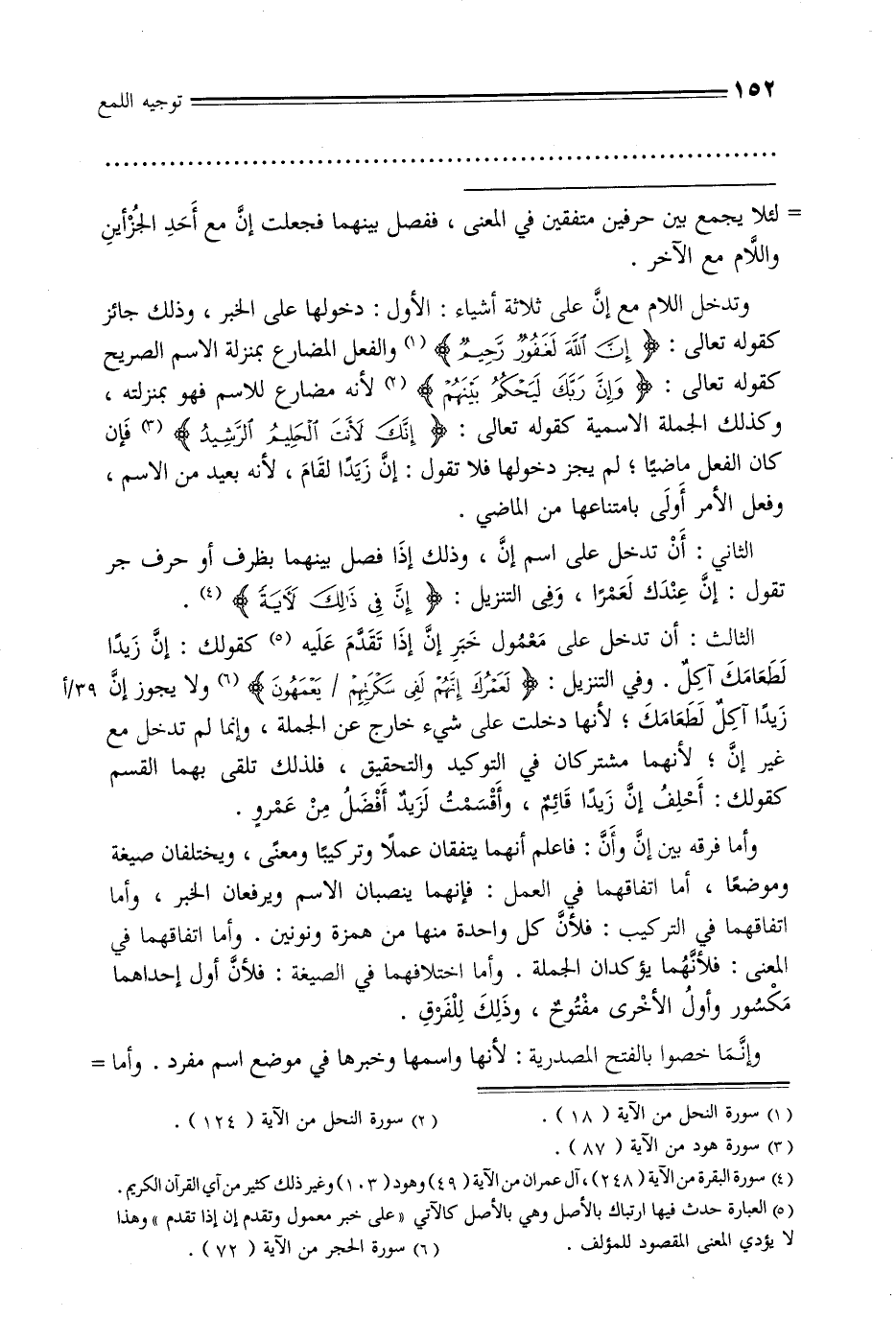 وتدخل اللام مع إن على ثلاثة أشياء: الأول: دخولها على الخبر, وذلك جائز كقوله تعالى: {إن الله لغفور رحيم} والفعل المضارع بمنزلة الاسم الصريح كقوله تعالى: {وإن ربك ليحكم بينهم} لأنه مضارع للاسم فهو بمنزلته, وكذلك الجملة الاسمية كقوله تعالى: {إنك لأنت الحليم الرشيد} فإن كان الفعل ماضيًا, لم يجز دخولها فلا تقول: إن زيدًا لقام, لأنه بعيد من الاسم, وفعل الأمر أولى بامتناعها من الماضي.
