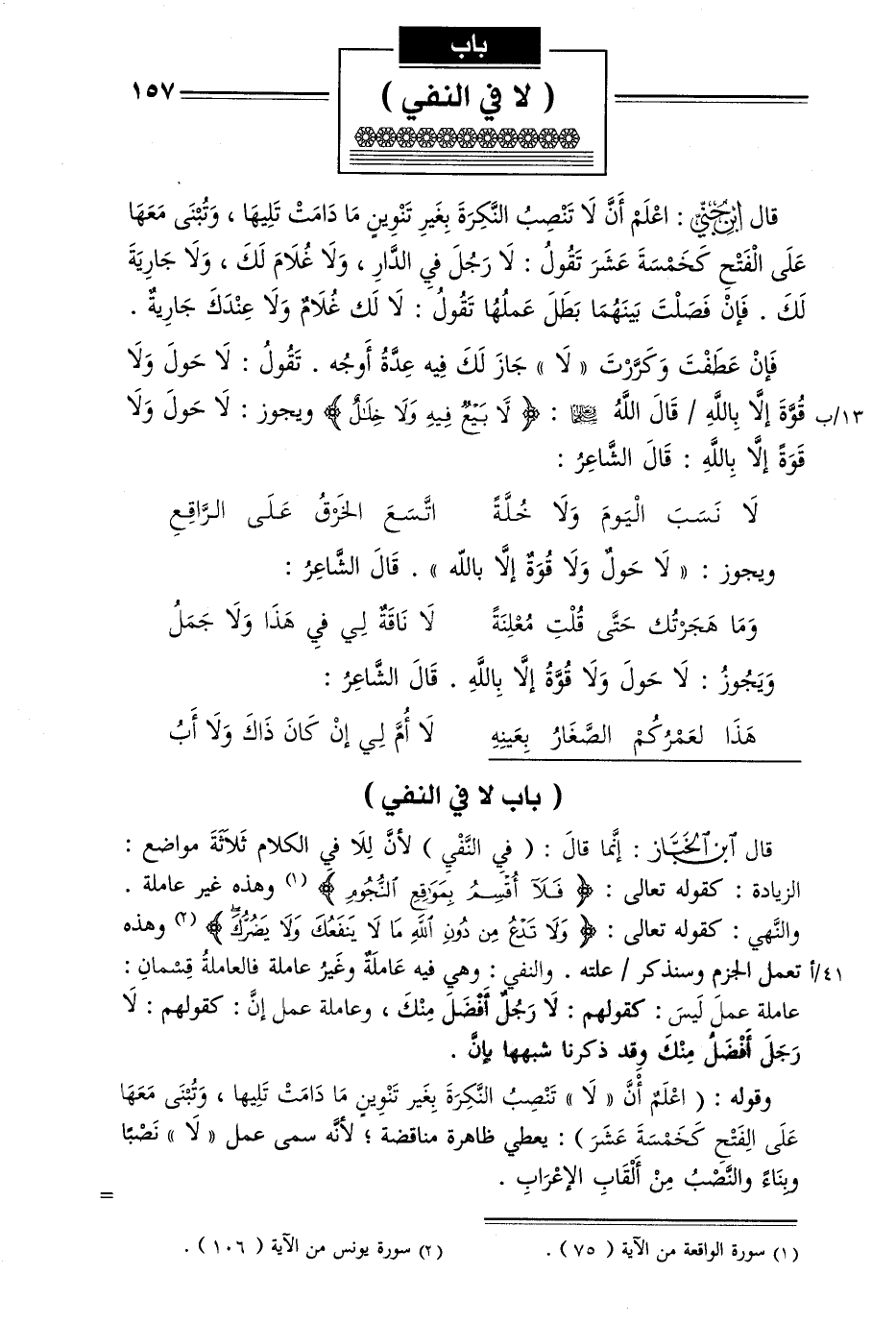 فإن عطفت وكررت «لا» جاز لك فيه عدة أوجه. تقول: لا حول ولا 13/ب قوة إلا بالله / قال الله عز وجل: {لا بيع فيه ولا خلال} ويجوز: لا حول ولا قوة إلا بالله: قال الشاعر: