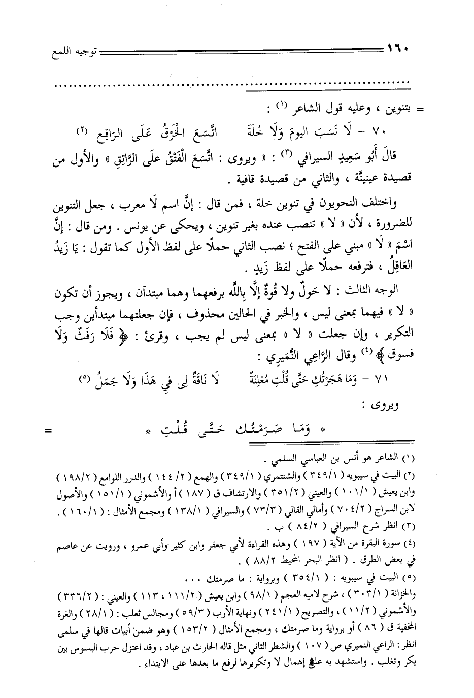 واختلف النحويون في تنوين خلة, فمن قال: إن اسم لا معرب, جعل التنوين للضرورة, لأن «لا» تنصب عنده بغير تنوين, ويحكى عن يونس. ومن قال: إن اسم «لا» مبني على الفتح, نصب الثاني حملًا على لفظ الأول كما تقولك يا زيد العاقل, فترفعه حملًا على لفظ زيد.