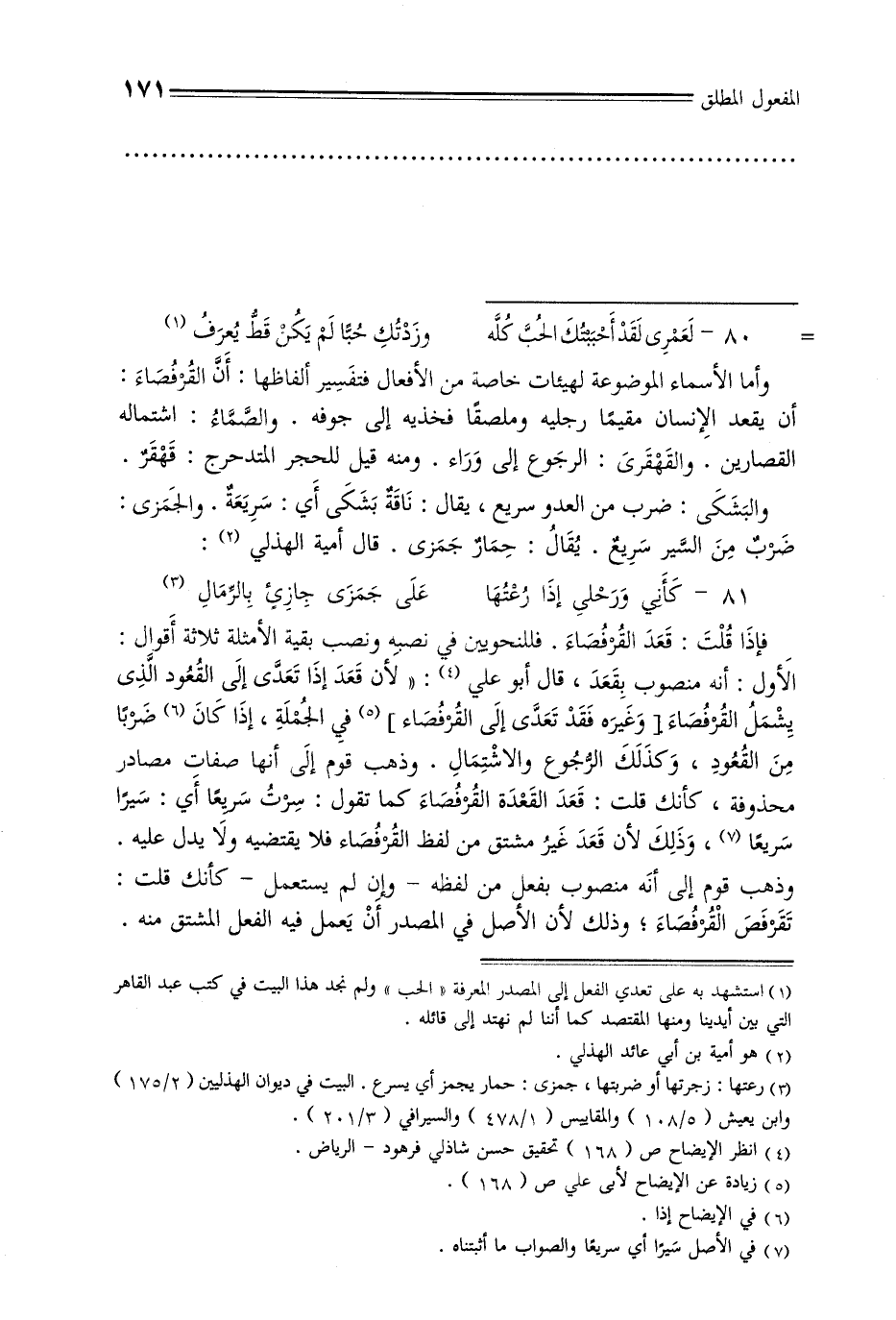 وأما الأسماء الموضوعة لهيئات خاصة من الأفعال فتفسير ألفاظها: أن القرفصاء: أن يقعد الإنسان مقيمًا رجليه وملصقًا فخذيه إلى جوفه. والصماء: اشتماله القصارين. والقهقرى: الرجوع إلى وراء. ومنه قيل للحجر المتدحرج: قهقر. والبشكي: ضرب من العدو سريع, يقال: ناقة بشكى أي: سريعة. والجمرى: ضرب من السير سريع. يقال: حمار جمرى. قال أمية الهذلي:
