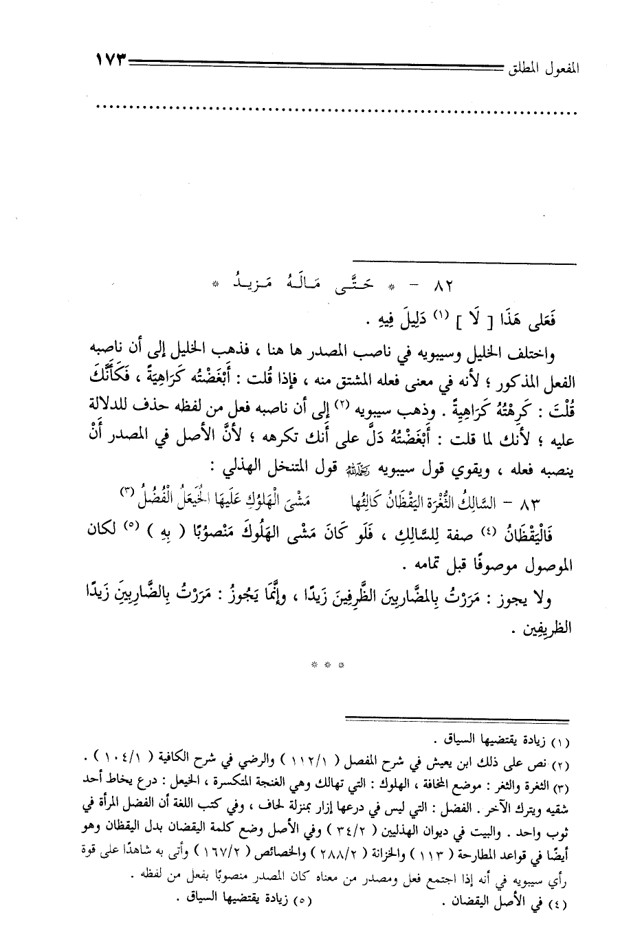 واختلف الخليل وسيبويه في ناصب المصدر ها هنا, فذهب الخليل إلى أن ناصبه الفعل المذكور, لأنه في معنى فعله المشتق منه, فإذا قلت: أبغضته كراهية, فكأنك قلت: كرهته كراهية. وذهب سيبويه إلى أن ناصبه فعل من لفظه حذف للدلالة عليه, لأنك لما قلت: أبغضته دل على أنك تكرهه, لأن الأصل في المصدر أن ينصبه فعله, ويقوي قول سيبويه رحمه الله قول المتنخل الهذلي: