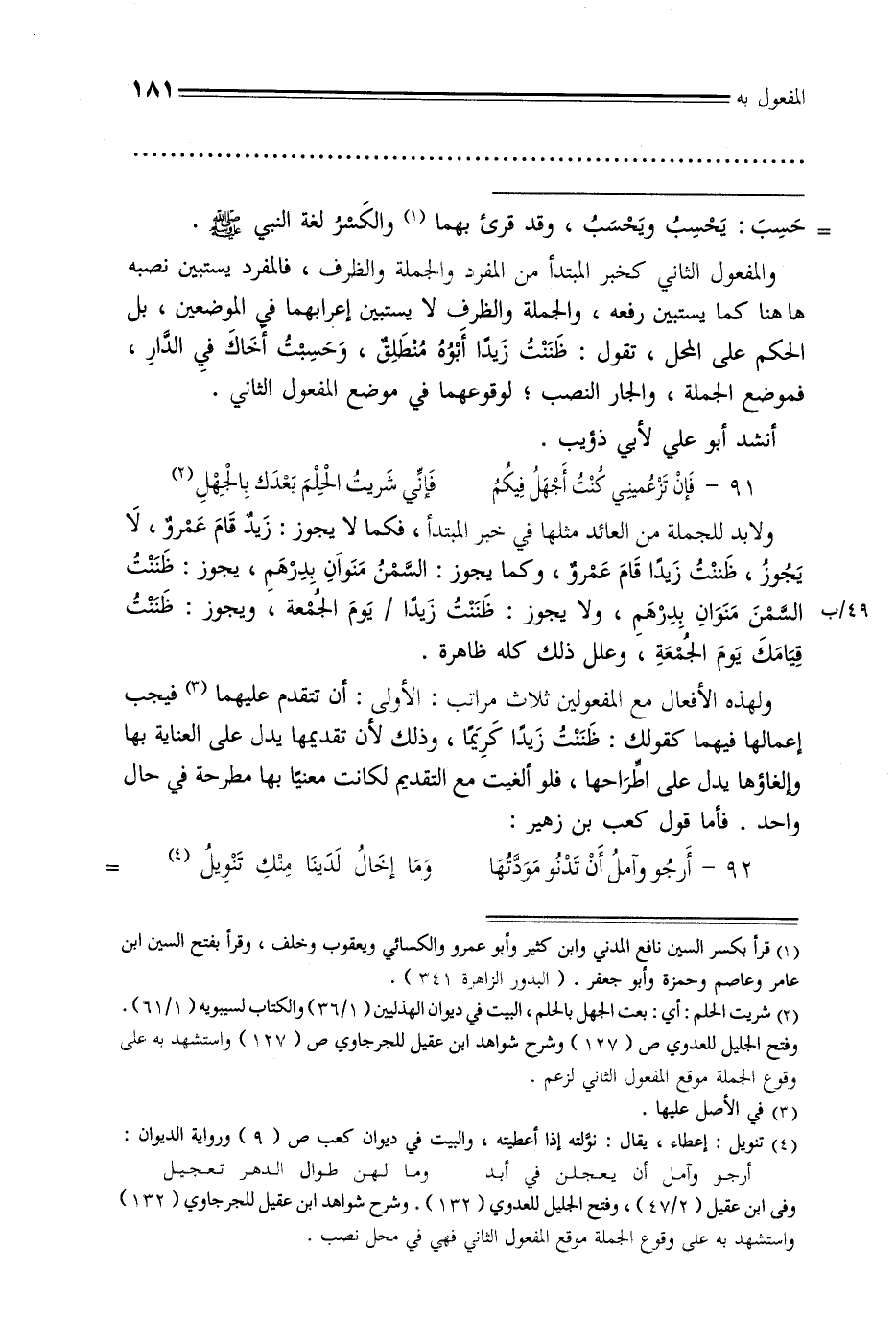 ولهذه الأفعال مع المفعولين ثلاث مراتب: الأولى: أن تتقدم عليهما فيجب إعمالهما فيهما كقولك: ظننت زيدًا كريمًا, وذلك لأن تقديمها يدل على العناية بها وإلغاؤها يدل على اطراحها, فلو ألغيت مع التقديم لكانت معنيًا بها مطرحة في حال واحد. فأما قول كعب بن زهير: