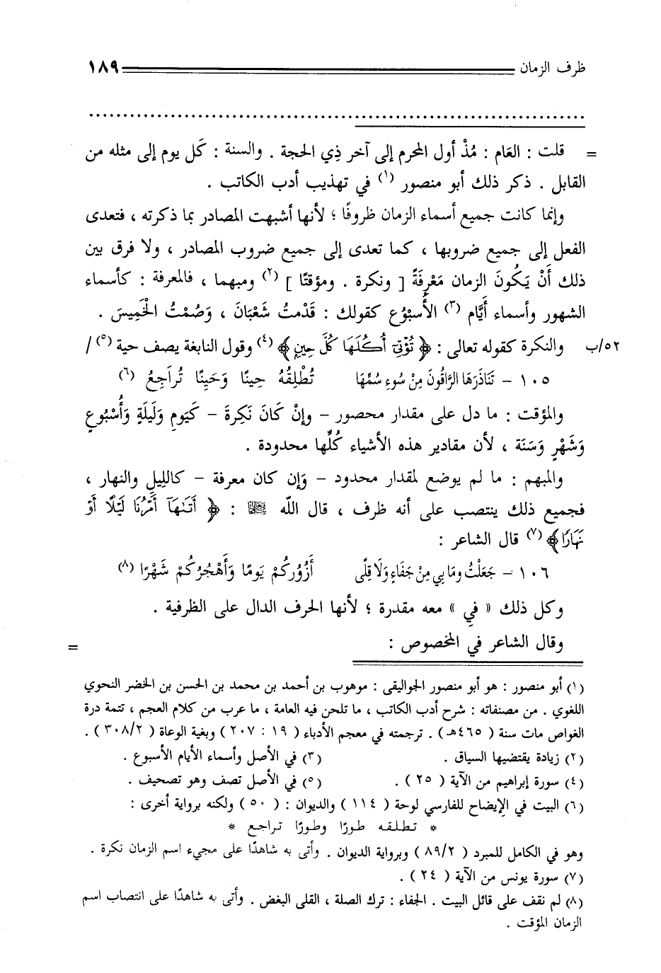 والمبهم: ما لم يوضع لمقدار محدود - وإن كان معرفة - كالليل والنهار, فجميع ذلك ينتصب على أنه ظرف, قال الله عز وجل: {أتاها أمرنا ليلًا أو نهارًا} قال الشاعر: