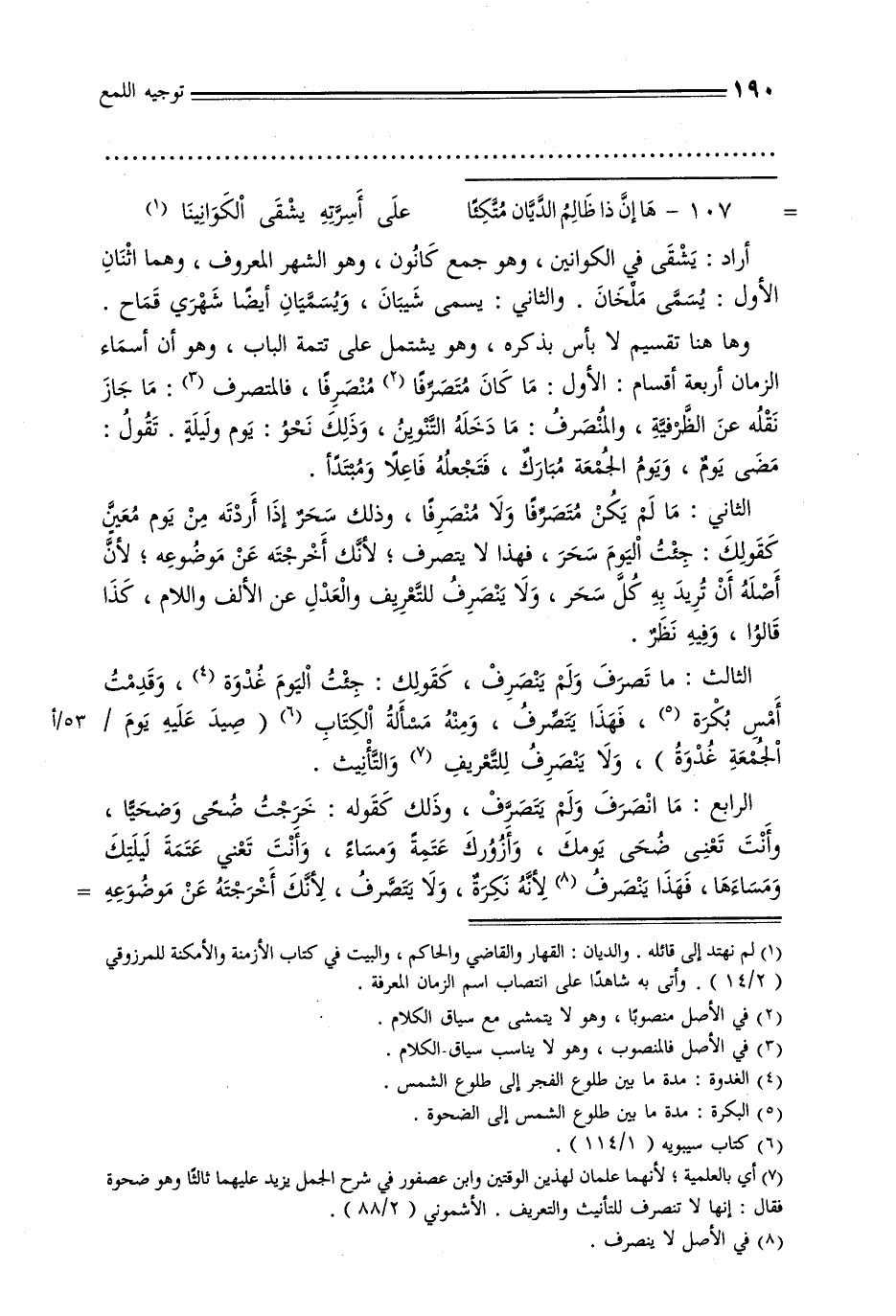 الرابع: ما انصرف ولم يتصرف, وذلك كقوله: خرجت ضحى وضحيًا, وأنت تعنى ضحى يومك, وأزورك عتمة ومساء, وأنت تعني عتمة ليلتك ومساءها, فهذا يتصرف لأنه نكرة, ولا يتصرف, لأنك أخرجته عن موضوعه =
