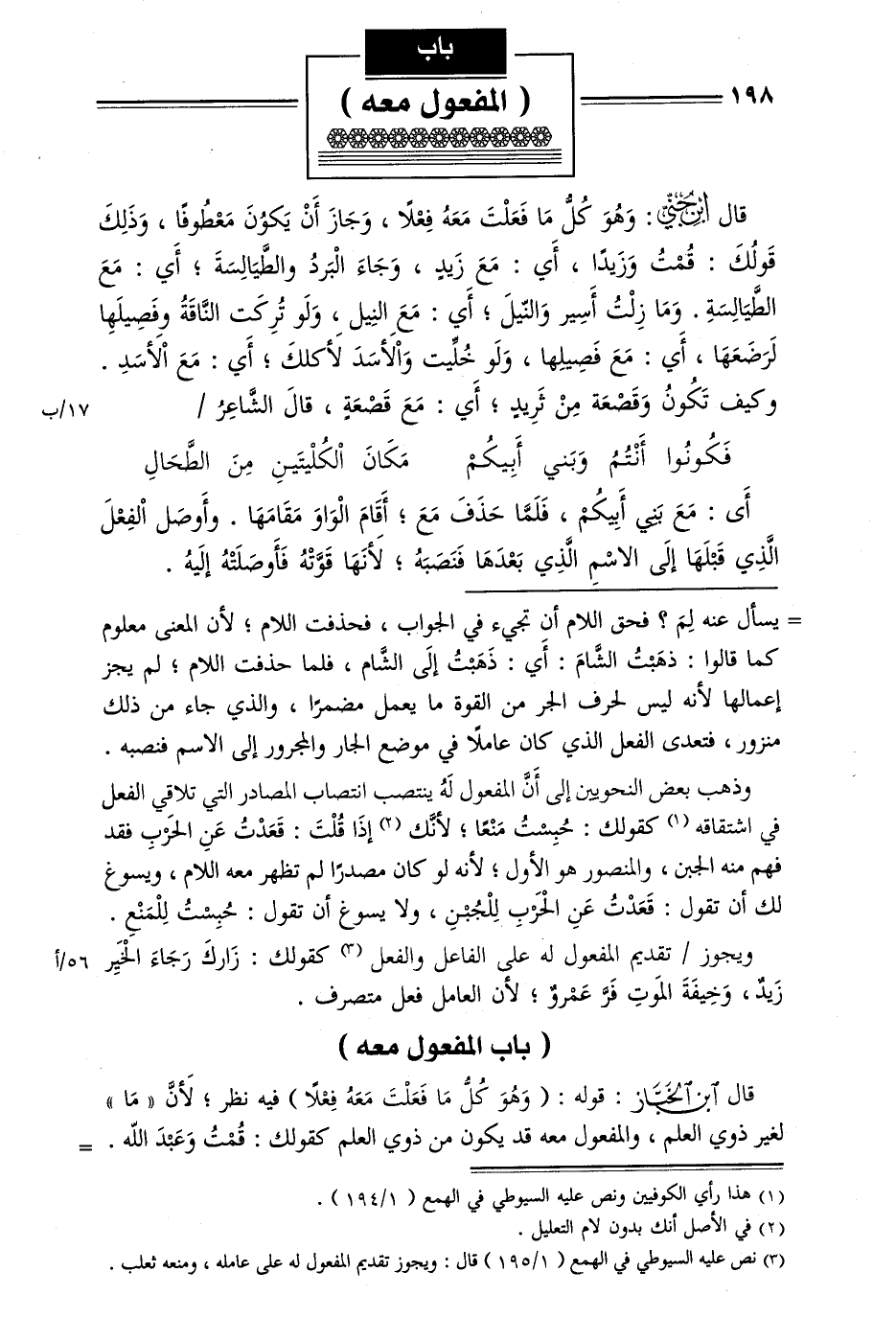 قال ابن جني: وهو كل ما فعلت معه فعلًا, وجاز أن يكون معطوفًا, وذلك قولك: قمت وزيدًا, أي: مع زيد, وجاء البرد والطيالسة, أي: مع الطيالسة. وما زلت أسير والنيل, أي: مع النيل, ولو تركت الناقة وفصليها لرضعها, أي: مع فصيلها, ولو خليت والأسد لأكلك, أي: مع الأسد. وكيف تكون وقصعة من تريد, أي: مع قصعة, قال الشاعر / ... 17/ب