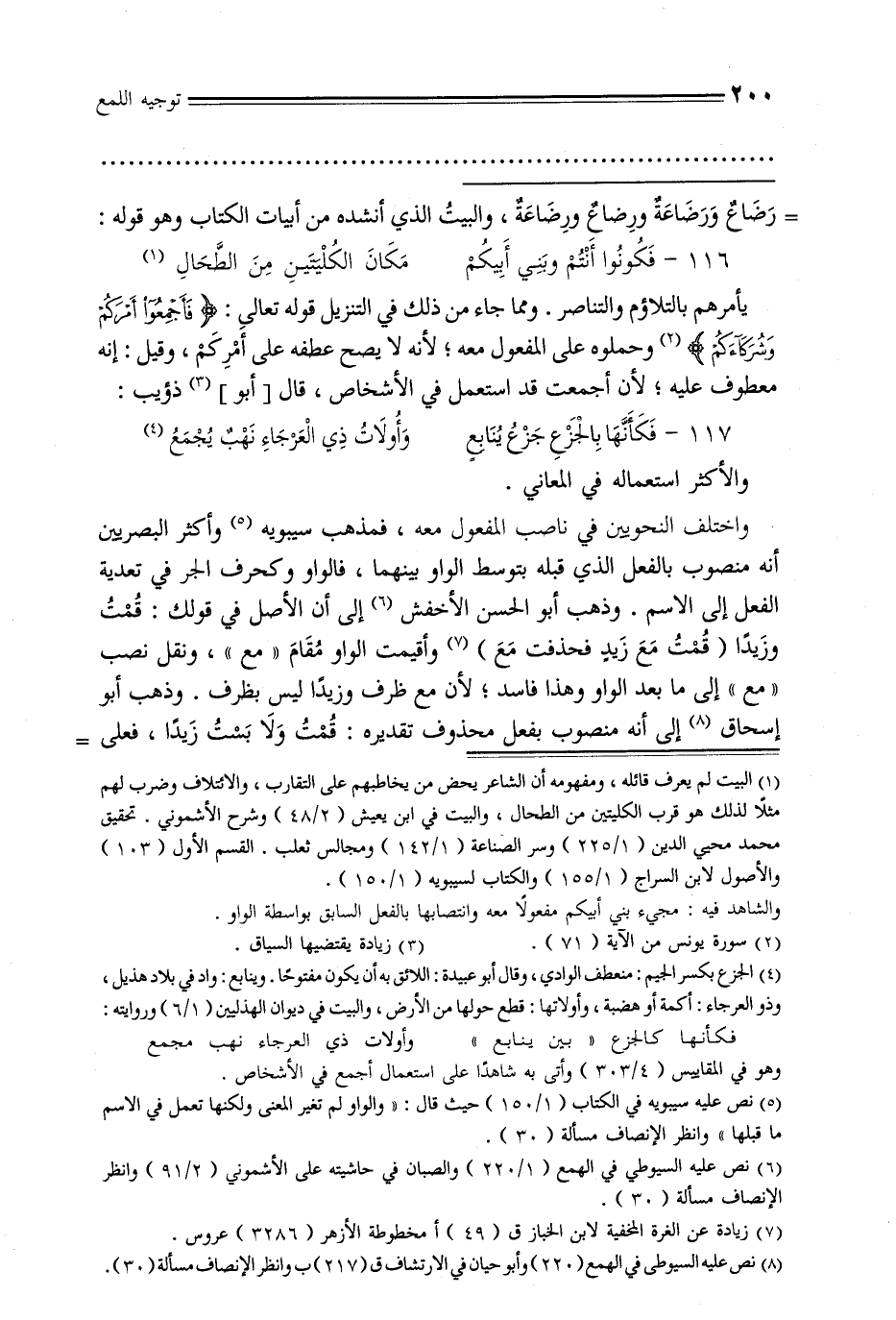 يأمرهم بالتلاؤم والتناصر. ومما جاء من ذلك في التنزيل قوله تعالى: {فأجمعوا أمركم وشركاءكم} وحملوه على المفعول معه, لأنه لا يصح عطفه على أمركم, وقيل: إنه معطوف عليه, لأن أجمعت قد استعمل في الأشخاص, قال [أبو] ذؤيب: