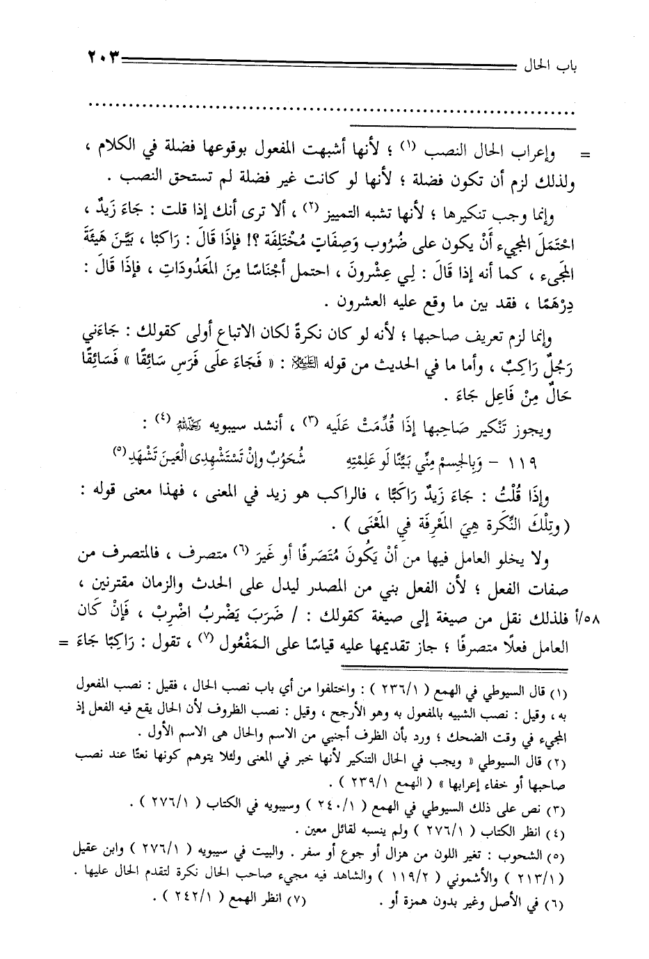 وإنما لزم تعريف صاحبها, لأنه لو كان نكرة لكان الاتباع أولى كقولك: جاءني رجل راكب, وأما في الحديث من قوله عليه السلام: «فجاء على فرس سائقًا» فسائقا حال من فاعل جاء.