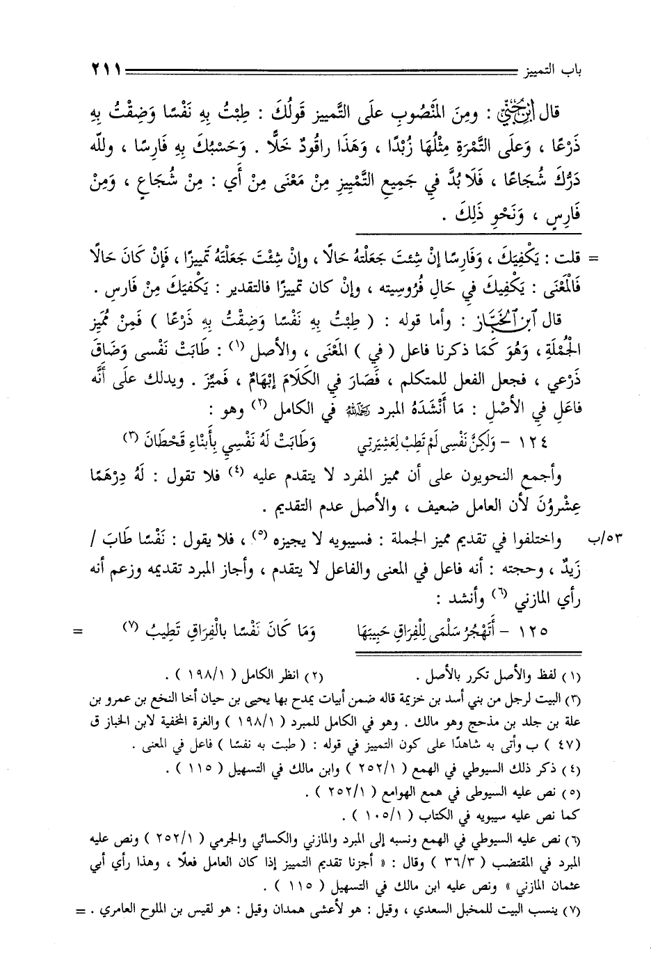53/ب واختلفوا في تقديم مميز الجملة: فسيبويه لا يجيزه, فلا يقول: نفسًا طاب / زيد, وحجته: أنه فاعل في المعنى والفاعل لا يتقدم, وأجاز المبرد تقديمه وزعم أنه رأي المازني وأنشد:
