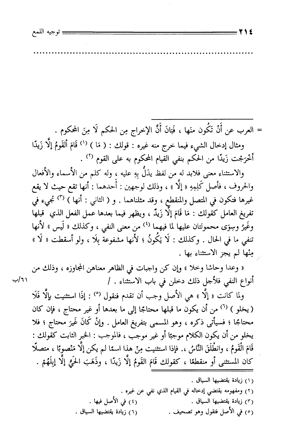 «وعدا وحاشا وخلا» وإن كن واجبات في الظاهر معناهن المجاوزه, وذلك من انواع النفي فلأجل ذلك دخلن في باب الاستثناء. / ... 61/ب