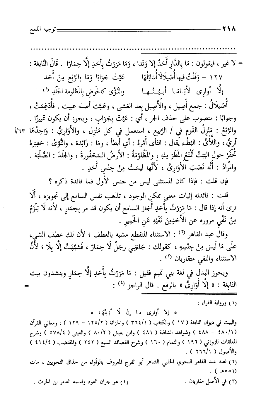 أصيلال: جمع أصيل, والأصيل بعد العشى, وعيت أصله عييت. فأدغمت, وجوابًا: منصوب على حذف الجر, أي: عيت بجواب, ويجوز أن يكون تمييزًا. والربع: منزل القوم في / الربيع, استعمال في كل منزل, والأواري: واحدها 63/أآري, واللأى: البطء يقال: التأى أمره: أي أبطأ, وما: زائدة, والنؤى: حفيره تحفر حول البيت تمنع المطر منه, والمظلومة: الأرض المحفورة, والجلد: الصلبة. والمراد: أنه نصب الأوارى, لأنها ليست من جنس أحد.