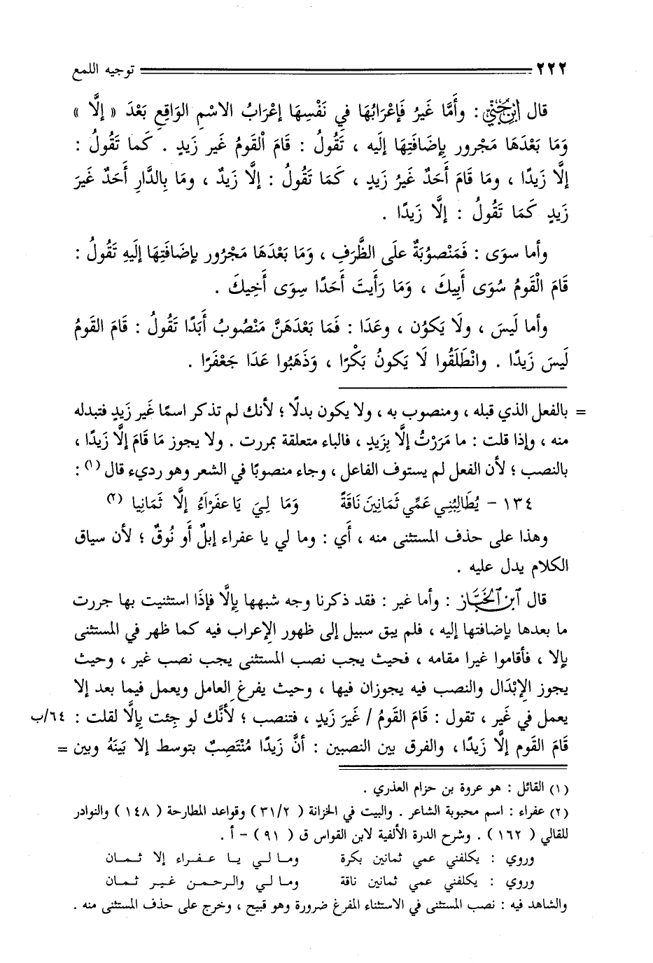 قال ابن جني: وأما غير فإعرابها في نفسها إعراب الاسم الواقع بعد «إلا» وما بعدها مجرور بإضافتها إليه, تقول: قام القوم غير زيد. كما تقول: إلا زيدًا, وما قام أحد غير زيد, كما تقول: إلا زيد, وما بالدار أحذ غير زيد كما تقول: إلا زيدًا.