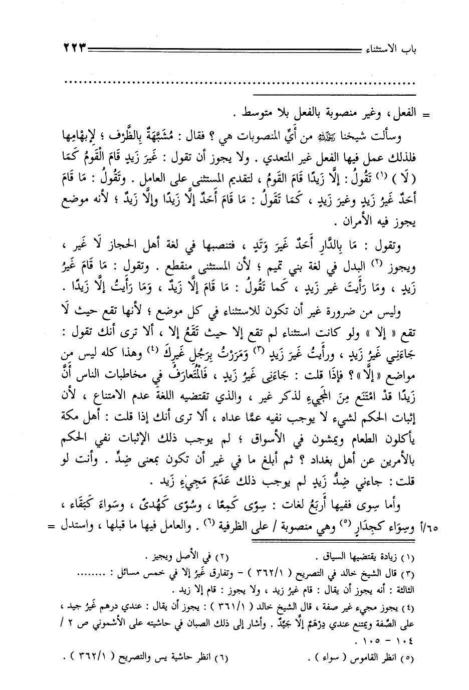 وسألت شيخنا رحمه الله من أي المنصوبات هي؟ فقال: مشتبهة بالظرف, لإبهامها فلذلك عمل فيها الفعل غير المتعدي. ولا يجوز أن تقول: غير زيد قام القوم كما (لا) تقول: إلا زيدًا قام القوم, لتقديم المستثنى على العامل. وتقول: ما قام أحد غير زيد وغير زيد, كما تقول: ما قام أحد إلا زيدًا وإلا زيد, لأنه موضع يجوز فيه الأمران.